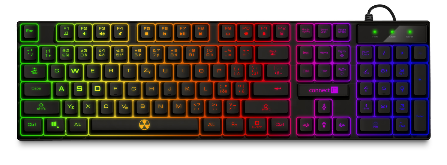 Barevné RNBW LED podsvícení všech kláves i znaků pro použití večer, v noci nebo obecně za zhoršených světelných podmínek