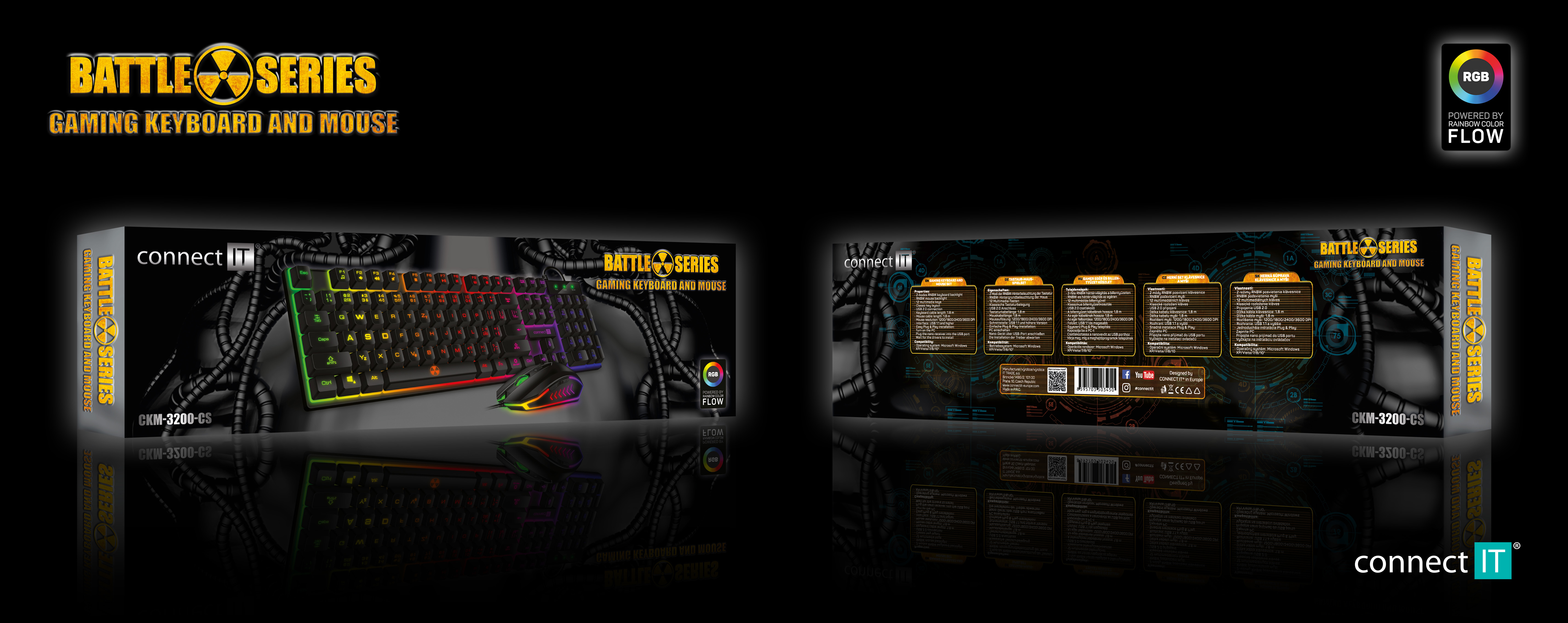 Profesionální gamingový set klávesnice a myši Battle series pro hráče počítačových her v českém a slovenském layoutu s RNBW podsvícením a třístupňovou regulací intenzity podsvícení klávesnice.