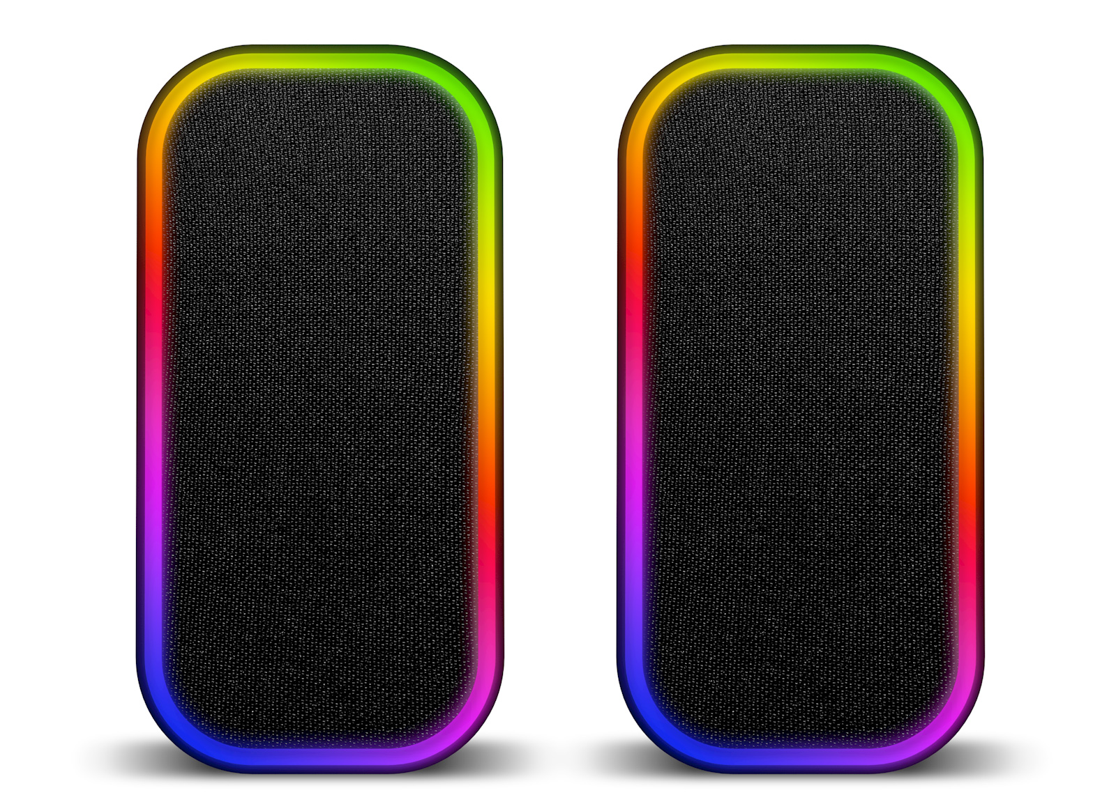 Reproduktory jsou vybaveny RGB Rainbow podsvícením a ovládáním hlasitosti/podsvícení/vstupu na kabelu.