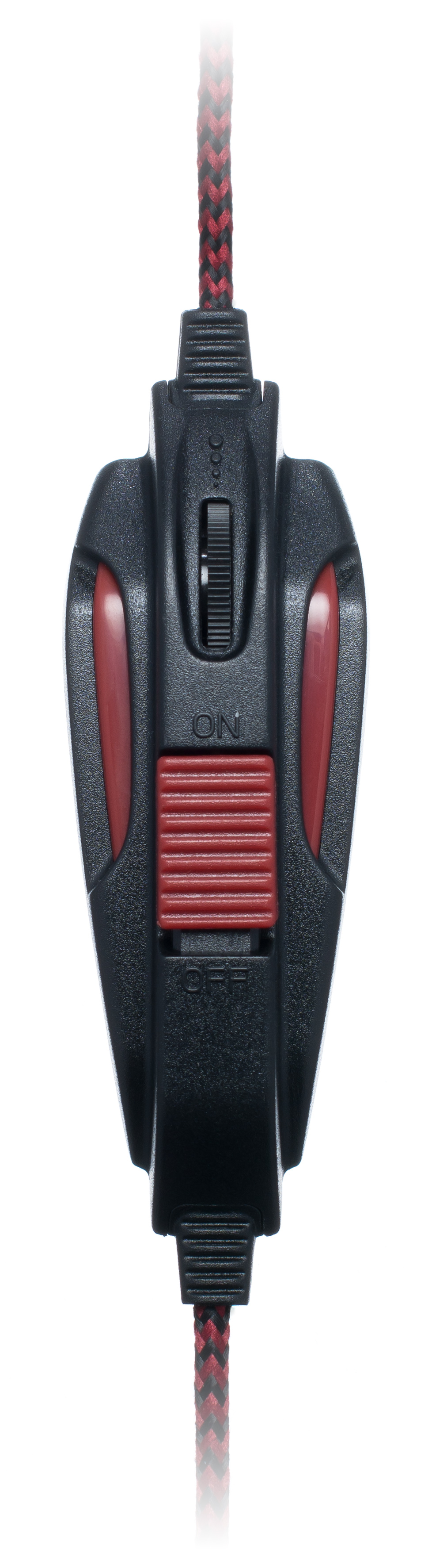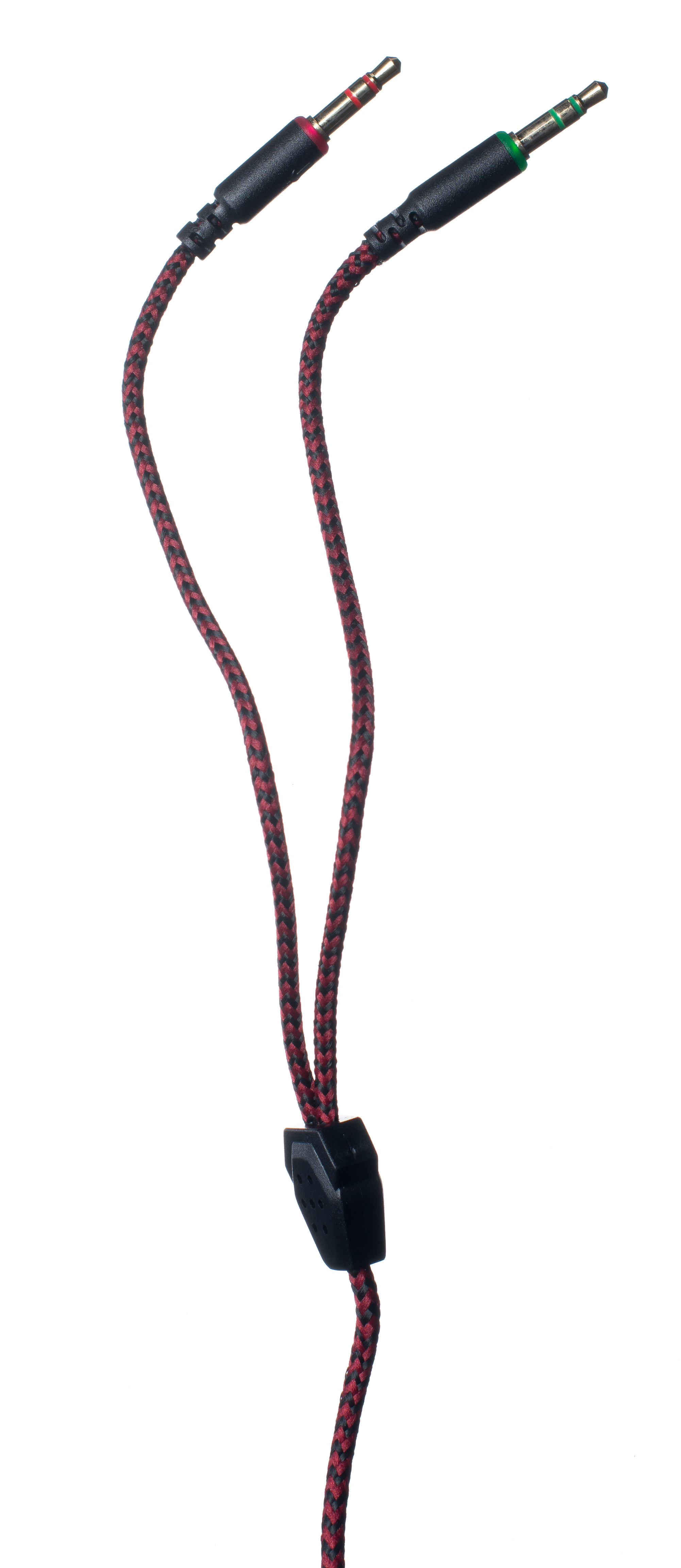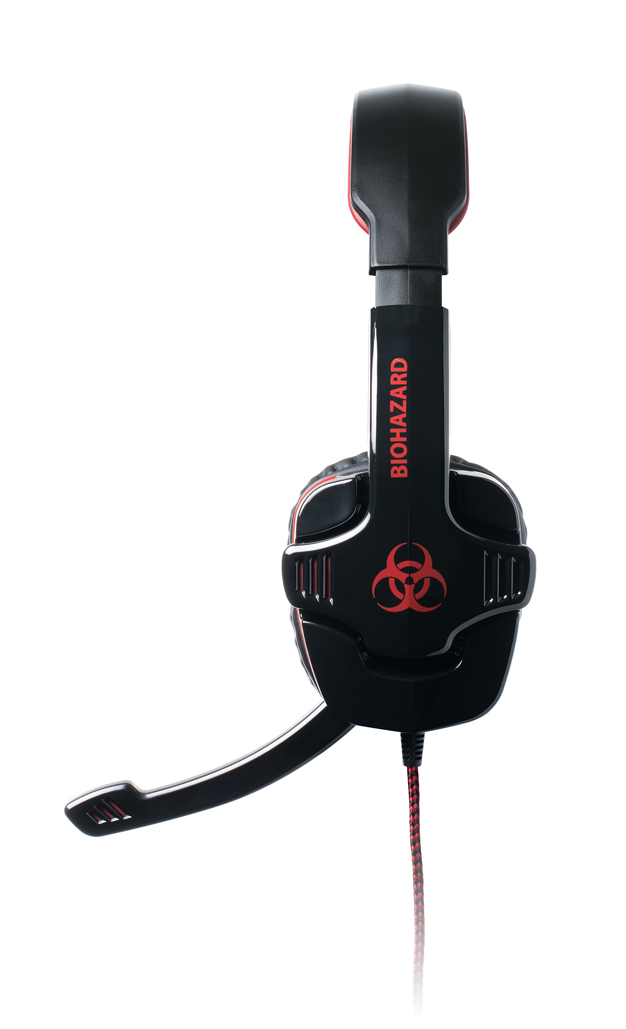 BIOHAZARD sluchátka s mikrofonem pro hráče v černo-červeném provedení, s ovládáním hlasitosti na kabelu, 2× 3,5mm jacky a 220 cm dlouhým kabelem.