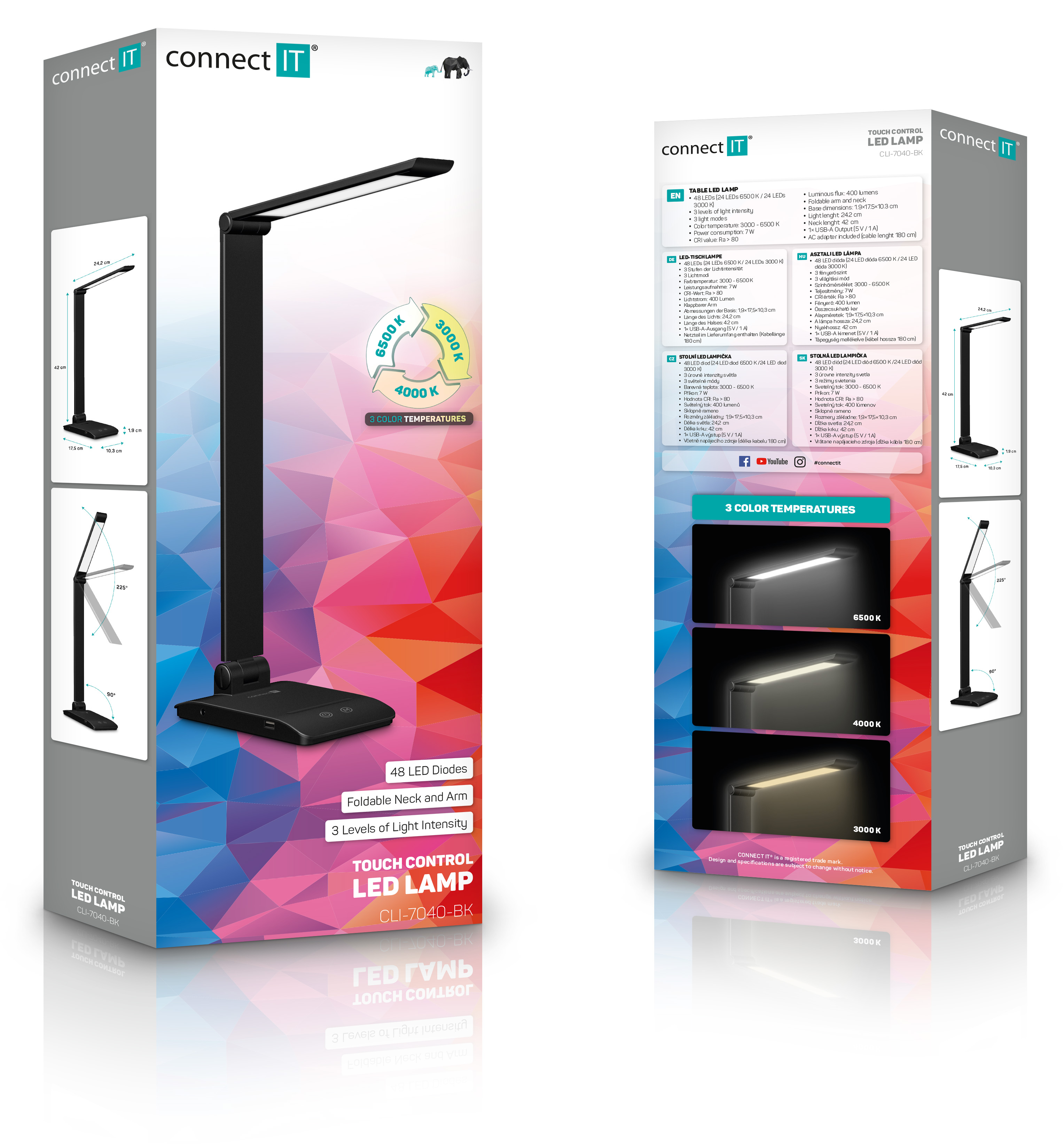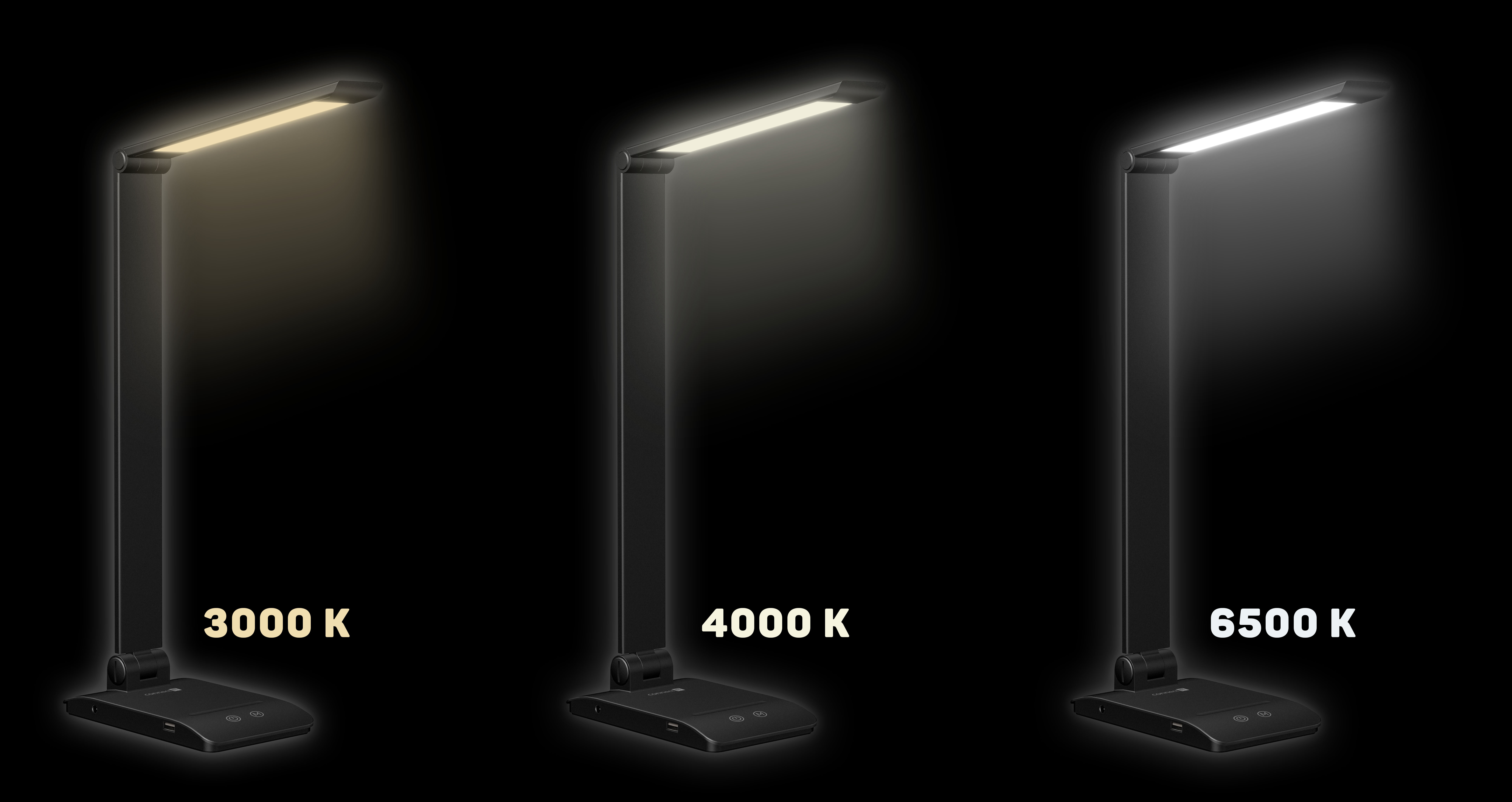 Díky sklopnému rameni a krku nastavíte dokonalý úhel pro jakoukoliv práci. Lampička disponuje USB-A výstupem s výkonem 5 W a dvěma praktickými dotykovými spínači, které umožňují zapnout/vypnout lampu, nastavit 3 úrovně jasu světla nebo nastavit barevnou teplotu světla ve 3 různých úrovních (3000/4000/6500 K).