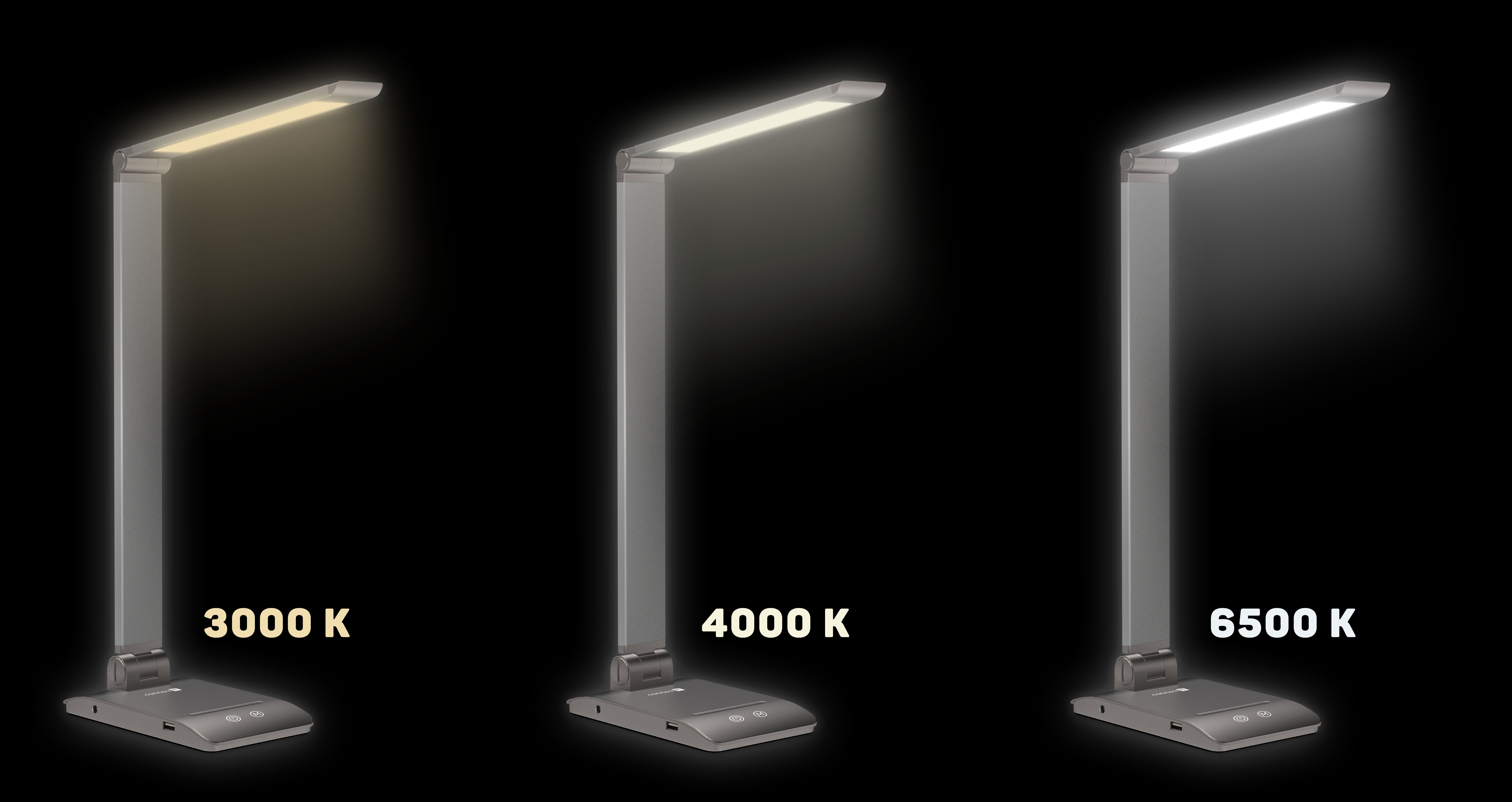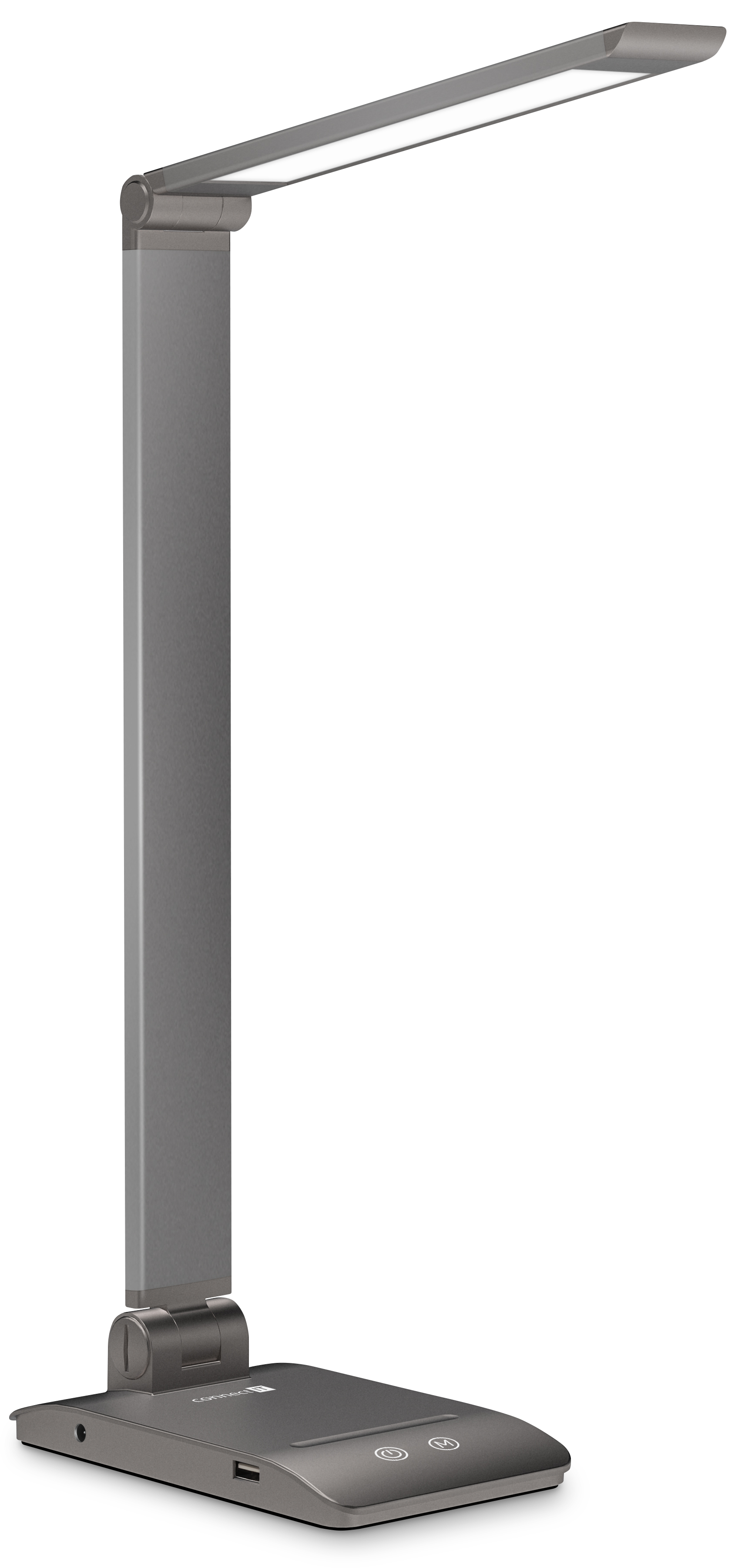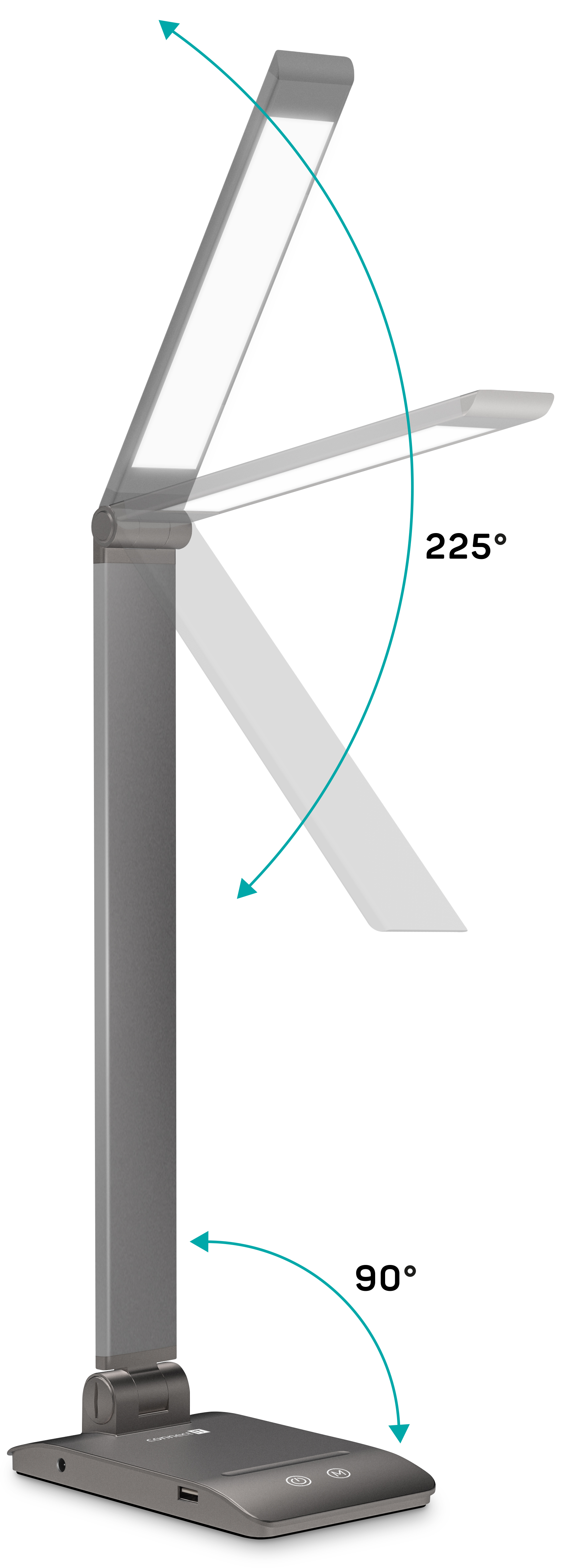 Díky sklopnému rameni a krku nastavíte dokonalý úhel pro jakoukoliv práci. Lampička disponuje USB-A výstupem s výkonem 5 W a dvěma praktickými dotykovými spínači, které umožňují zapnout/vypnout lampu, nastavit 3 úrovně jasu světla nebo nastavit barevnou teplotu světla ve 3 různých úrovních (3000/4000/6500 K).