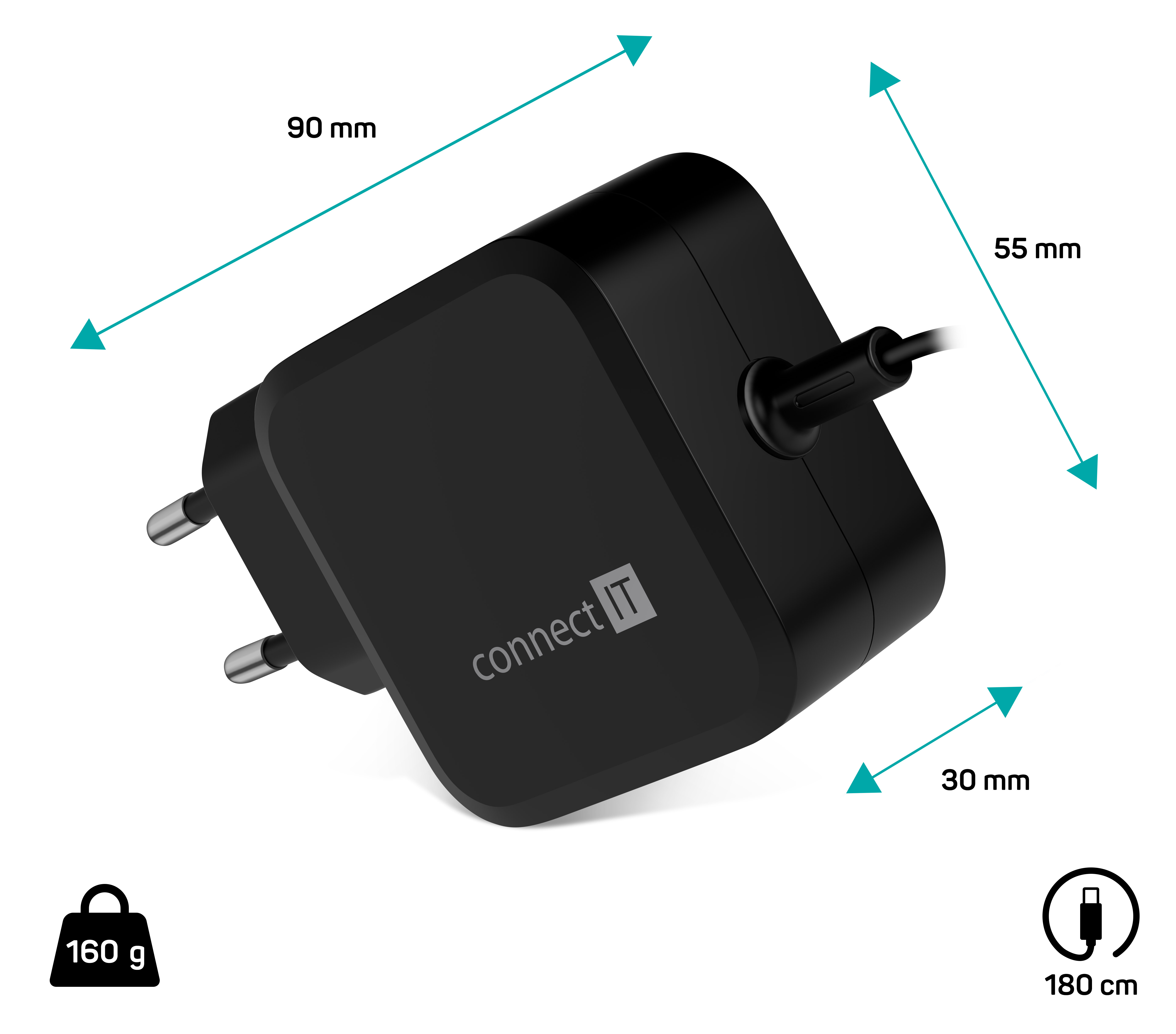 CONNECT IT C-Power Mini univerzální notebookový adaptér USB-C, PD 67 W, ČERNÝ
