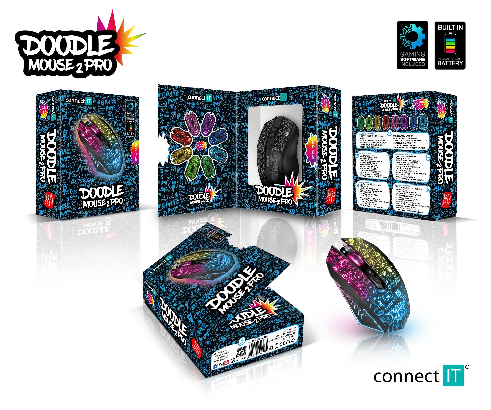 Precizní optický senzor má nastavitelnou citlivost až na 4800 DPI. Vysokou odolnost garantují špičkové mechanické spínače HUANO s životností 20 miliony kliknutí. Myš využívá technologii AutoPowerSave šetřící kapacitu baterie. Dodávaný SW s četnými nastaveními podporuje uživatelská makra, 5 uživatelských profilů a 6 programovatelných tlačítek včetně posuvného kolečka. Software je zdarma ke stažení na stránkách www.connectit-europe.com. Samozřejmostí je pozlacený USB Nano přijímač a dodávaný nabíjecí kabel.