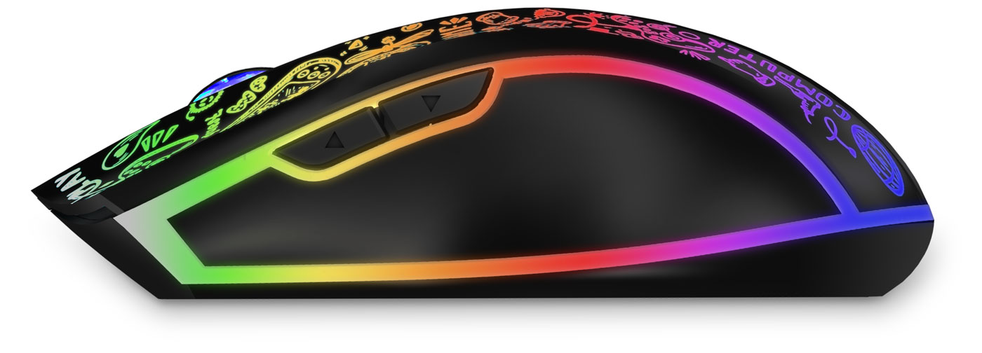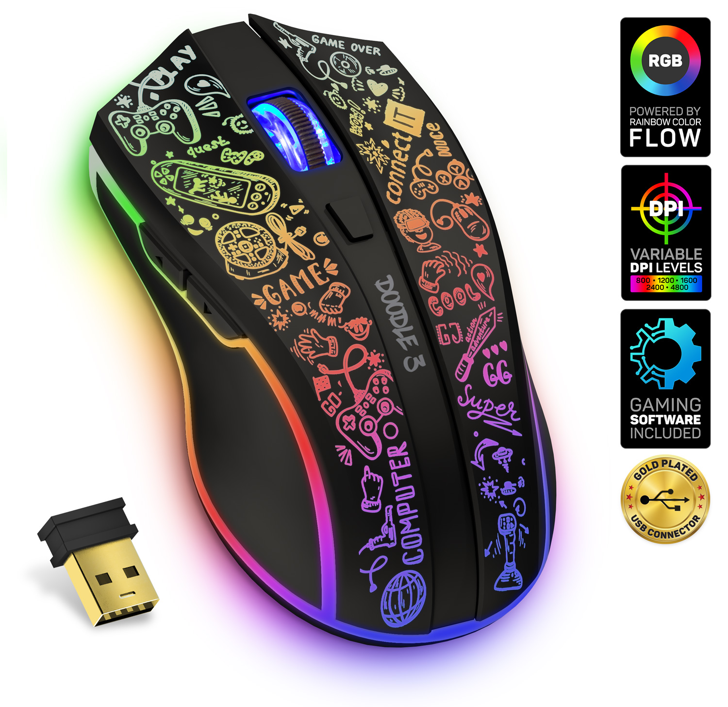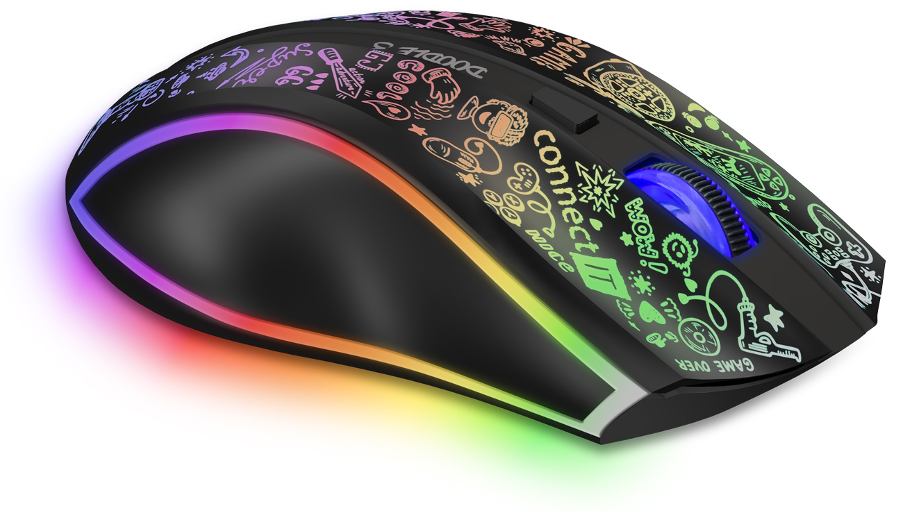 Profesionální bezdrátová gamingová myš DOODLE 3 pro hráče počítačových her s Rainbow podsvícením těla i kolečka v mixu 7 barev. Dodávaný SW s četnými nastaveními podporuje uživatelská makra, 5 uživatelských profilů a 6 programovatelných tlačítek včetně posuvného kolečka. Precizní optický senzor má nastavitelnou citlivost až na 4800 DPI.