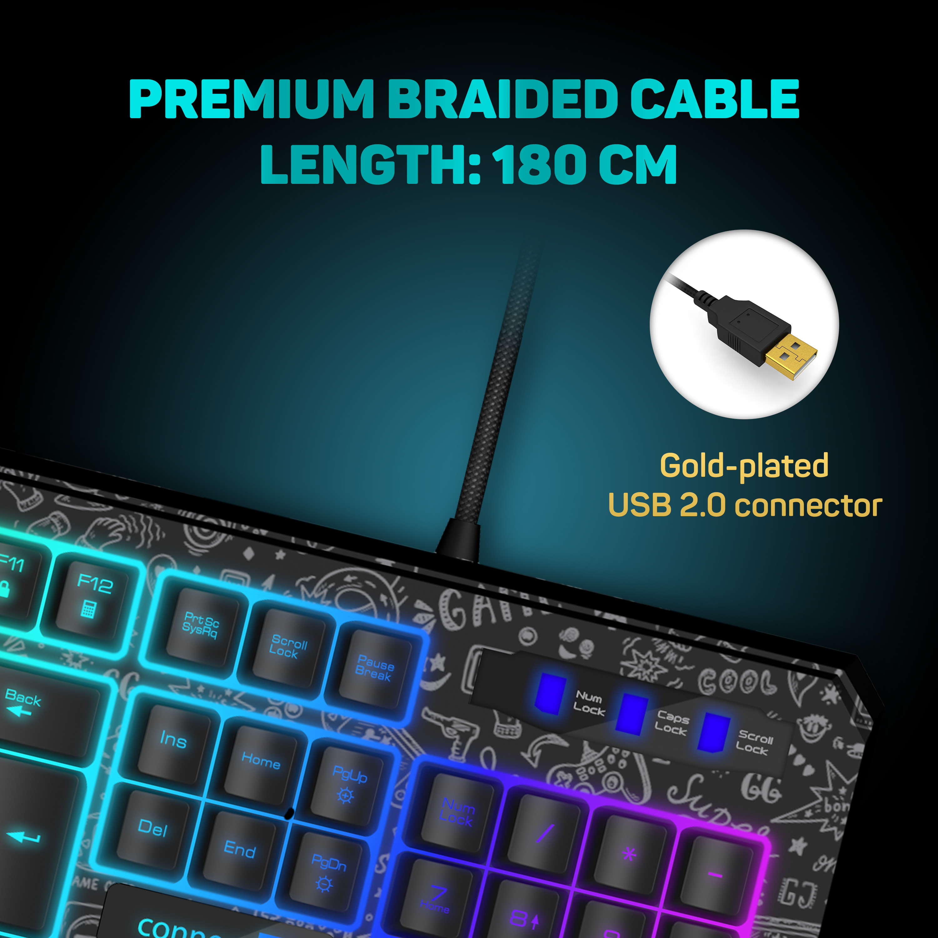 Kromě standardních funkcí nabízí 19 anti-ghost kláves, které zabraňují chybné interpretaci při stisknutí více kláves najednou. Unikátní DOODLE motiv, který tuto klávesnici vyzdvihuje na vyšší úroveň, je prolaserovaný i na spacebaru. Samozřejmostí je u této klávesnice prémiový oplet přívodního kabelu a pozlacený USB konektor.