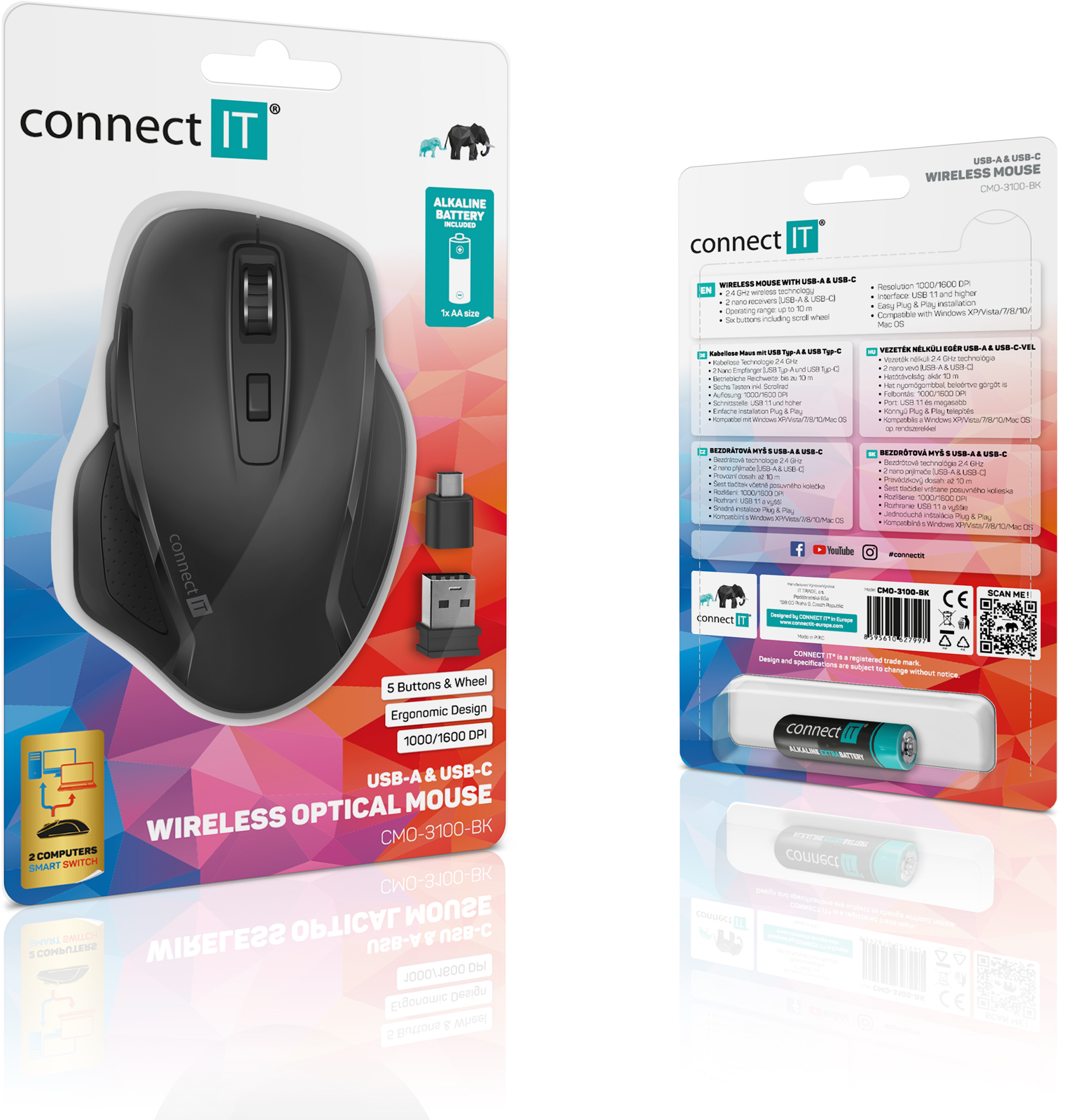 Bezdrátová optická myš s unikátní funkcí SmartSwitch, díky které můžete používat myš střídavě na dvou počítačích nebo noteboocích a libovolně se mezi nimi přepínat. Tato funkce se hodí do domácího i profi kancelářského prostředí, kde se pracuje s jednou myší střídavě na dvou počítačích nebo noteboocích. Jedinečný design myši dovoluje uschovat oba USB Nano příjímače pod krytkou bateriového prostoru ve spodní části myši a zabránit tak jejich ztrátě. Součástí balení je originální alkalická tužková baterie CONNECT IT.