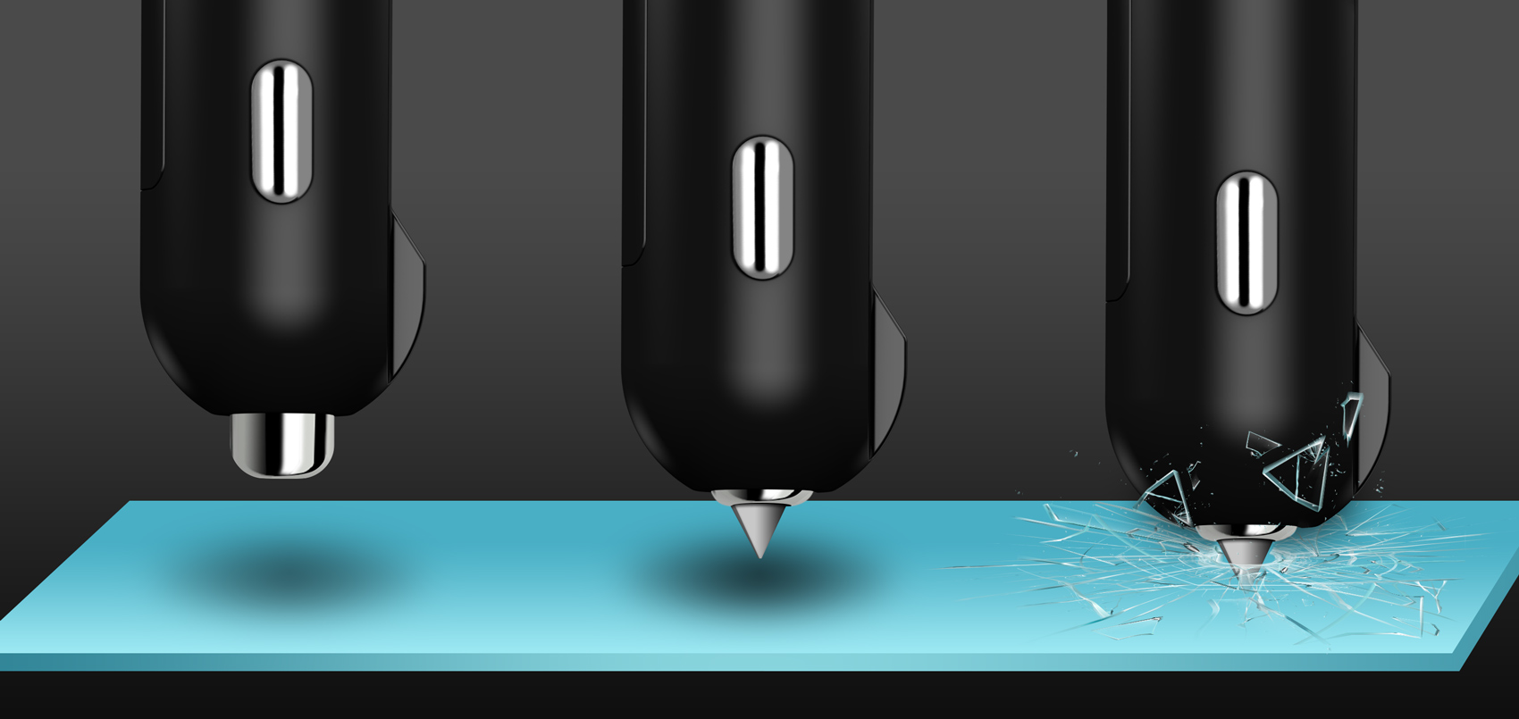 Integrovaný hrot skrytý ve spodní části nabíjecího pinu pro spolehlivé a rychlé rozbití skla automobilu v případě nehody nebo nouze