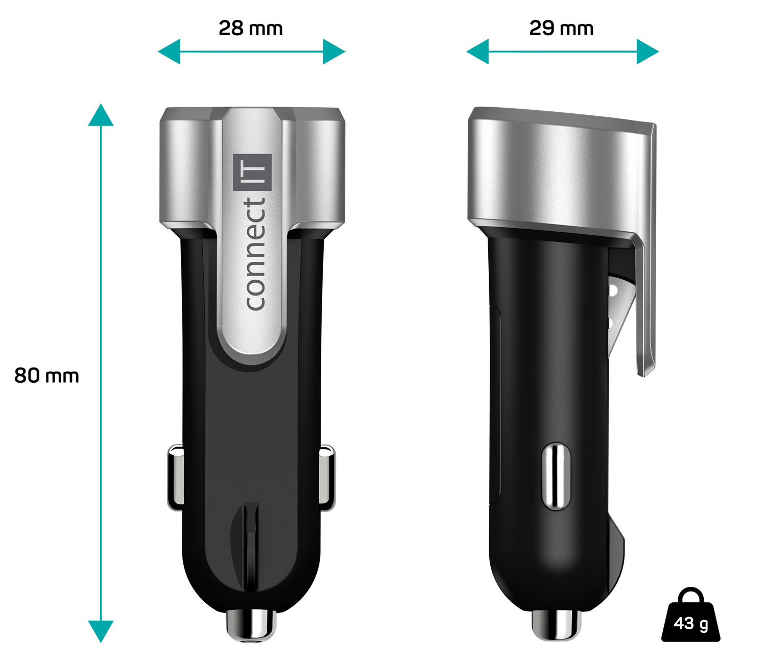 Buďte připraveni na jakoukoliv nepředvídatelnou situaci a nezůstaňte uvězněni ve svém autě po nehodě. S touto unikátní nabíječkou rychle a spolehlivě rozbijete sklo automobilu a stejně tak i přeřežete bezpečnostní pás. Hrot na rozbití skla i skalpel na přeřezání pásu jsou bezpečně skryté v těle nabíječky.