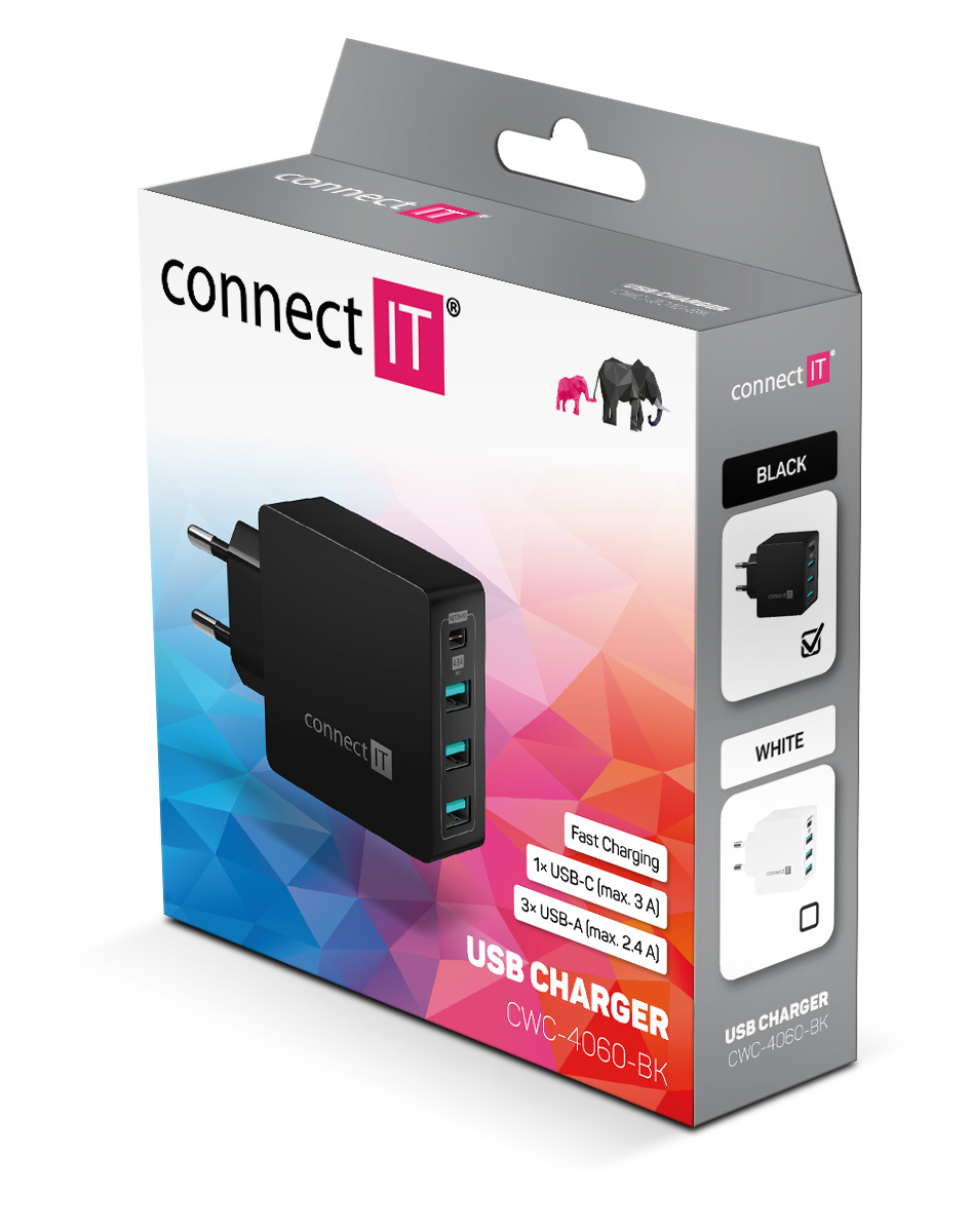 Cestovní USB nabíječka CONNECT IT "Fast Charge" určená pro napájení i nabíjení mobilních telefonů, tabletů, akčních kamer, elektronických čteček knih, MP3 a MP4 přehrávačů, herních konzolí a mnoha dalších přenosných zařízení doma, v kanceláři i na cestách.
