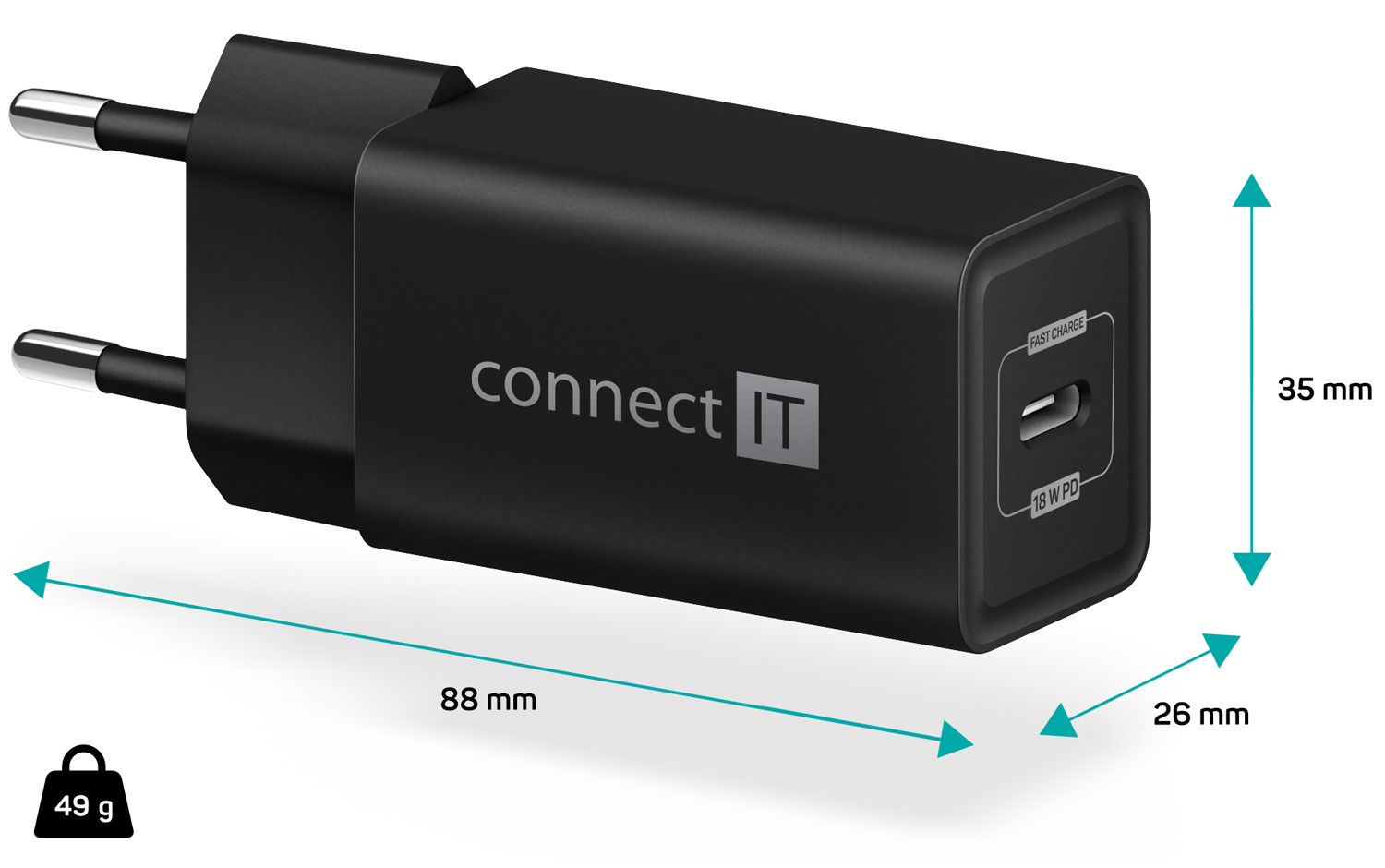 Cestovní USB nabíječka CONNECT IT "Fast PD Charge" určená pro napájení i nabíjení mobilních telefonů, tabletů, power bank, akčních kamer, elektronických čteček knih, MP3 a MP4 přehrávačů, herních konzolí a mnoha dalších přenosných zařízení doma, v kanceláři i na cestách. Technologie Power Delivery (PD) umožňuje rychlonabíjení o výkonu 18 W.