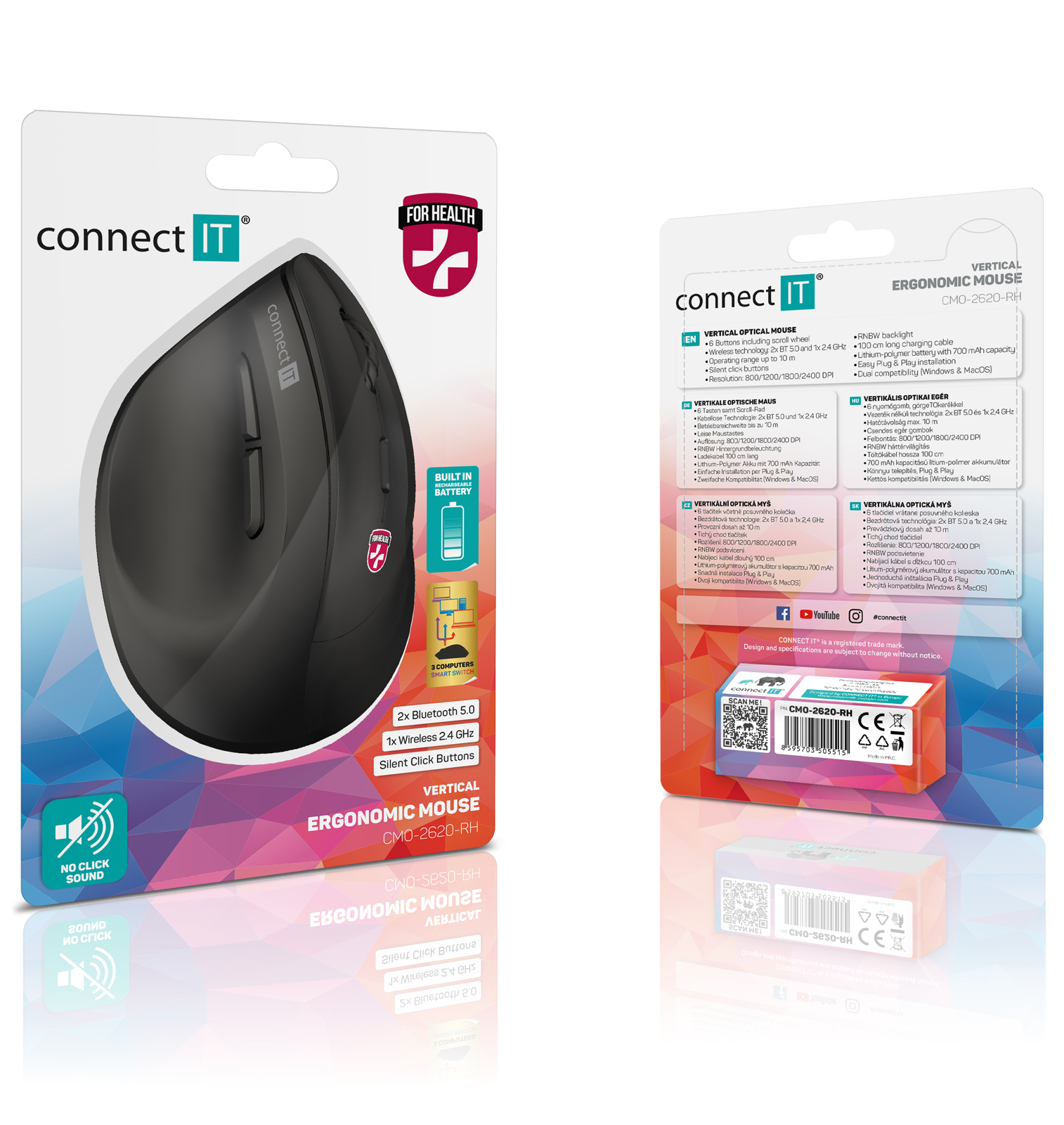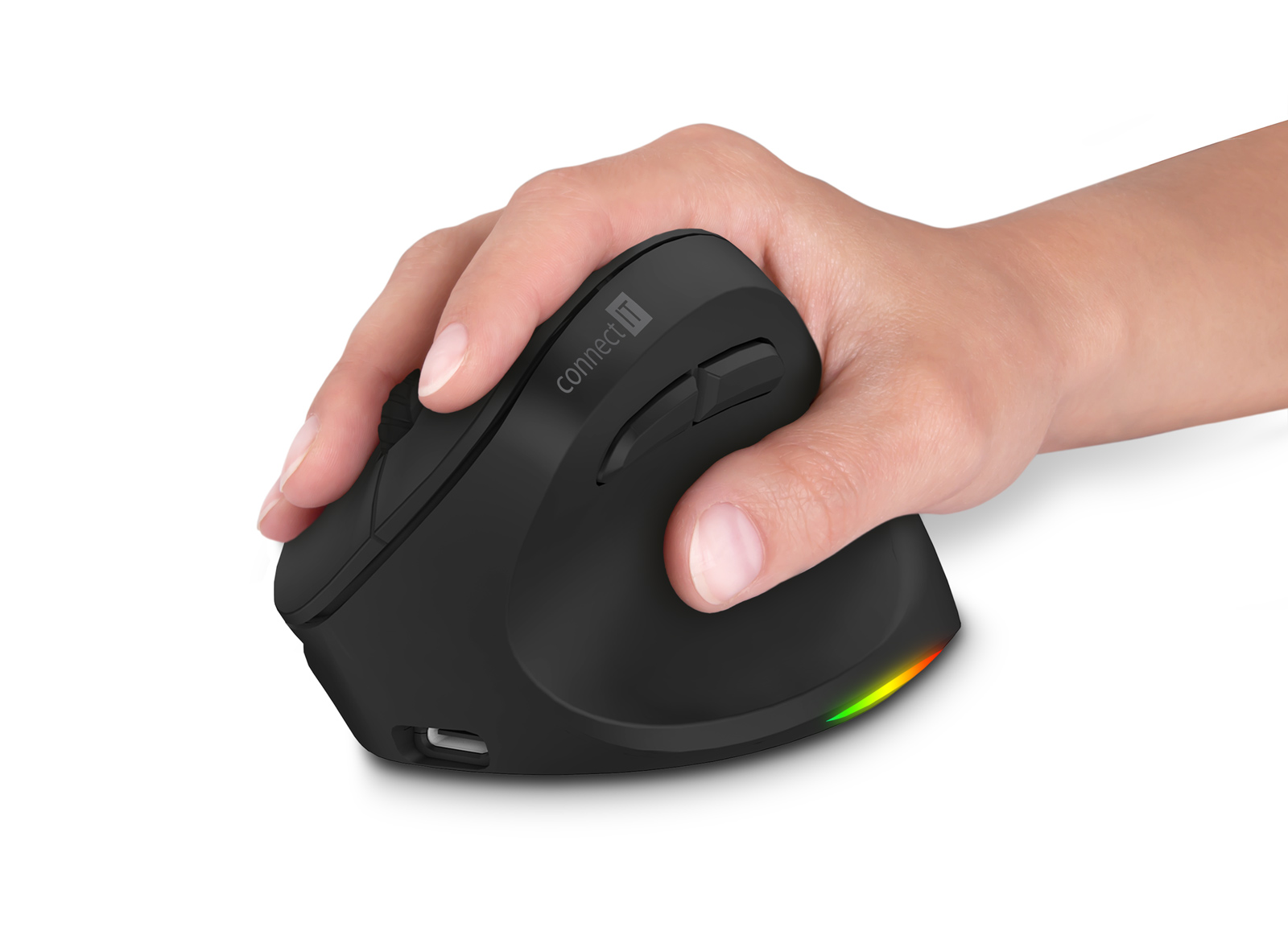 Vertikální ergonomická optická bezdrátová myš FOR HEALTH Cloudy BLACK určená speciálně jako prevence proti syndromu karpálního tunelu. Nabízí možnost připojení až na tři zařízení díky technologii TriMode (2x BT 5.0 + 2.4 GHz wireless). Disponuje RGB podsvícením, 6 tlačítky včetně precizního rolovacího kolečka a rozlišením až 2400 DPI.
