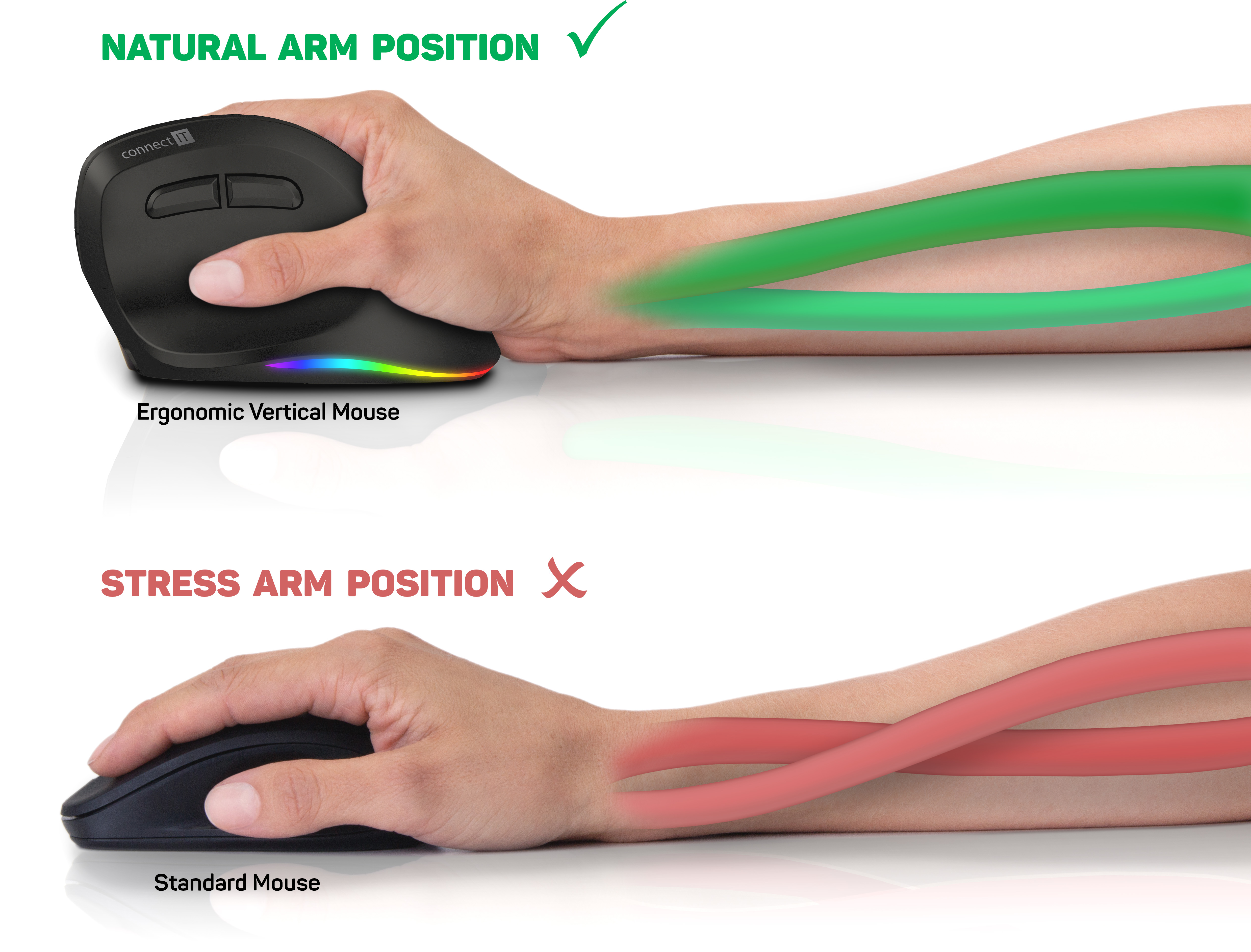 Při práci s běžnou počítačovou myší jsou kosti předloktí v nepřirozeně zkřížené poloze a již po krátké době dochází k bolestem a únavě celého předloktí. Při dlouhodobém používání takové myši může dojít k chornickým problémům s nutností vyhledat lékařskou pomoc.