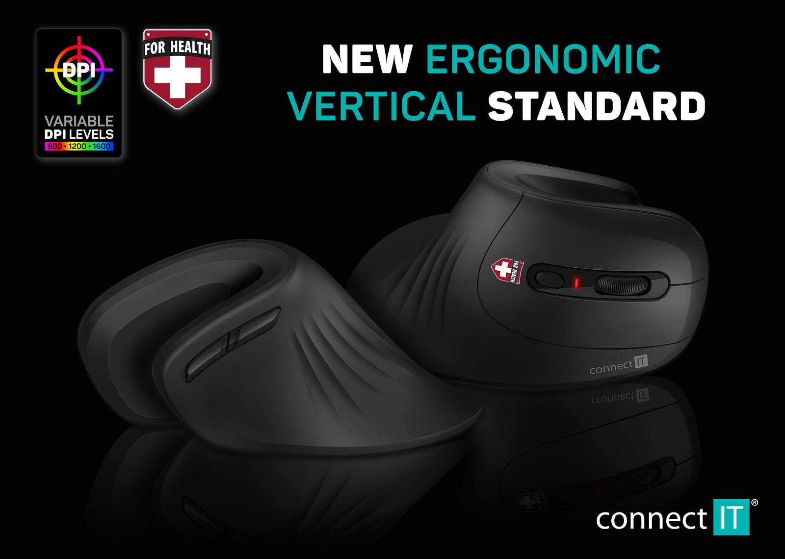 CONNECT IT FOR HEALTH ErgoMax ergonomická vertikální myš, (+ 1x AA baterie zdarma), bezdrátová, ČERNÁ