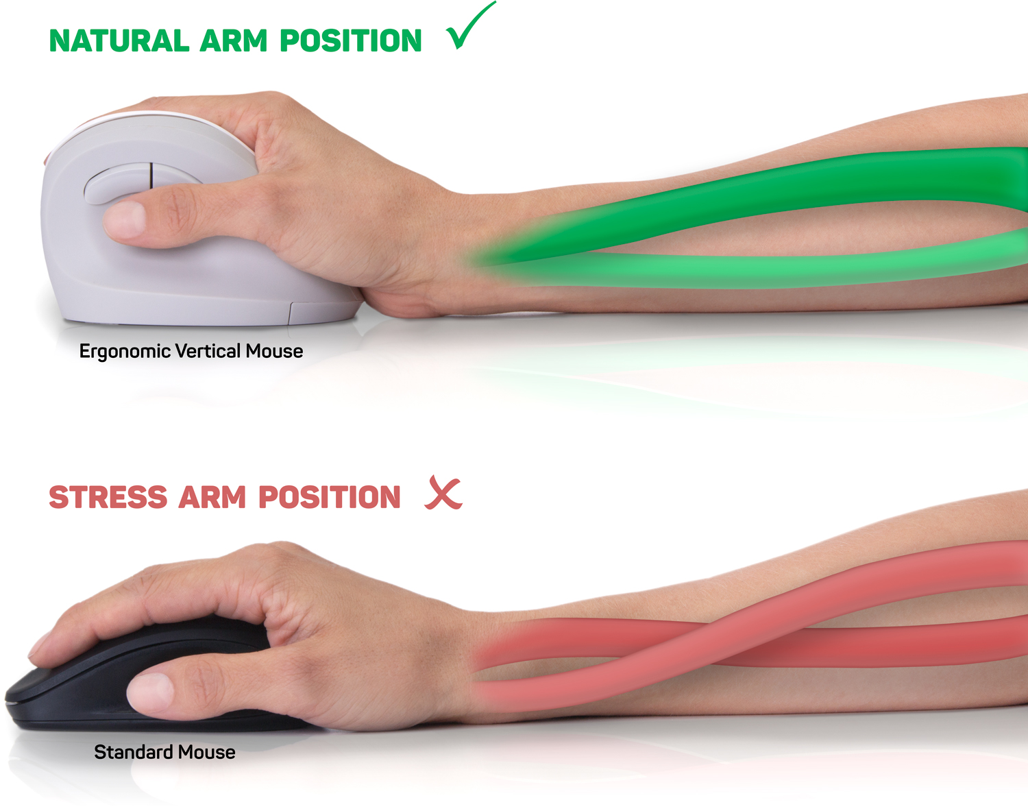 Při práci s běžnou počítačovou myší jsou kosti předloktí v nepřirozeně zkřížené poloze a již po krátké době dochází k bolestem a únavě celého předloktí. Při dlouhodobém používání takové myši může dojít k chornickým problémům s nutností vyhledat lékařskou pomoc.