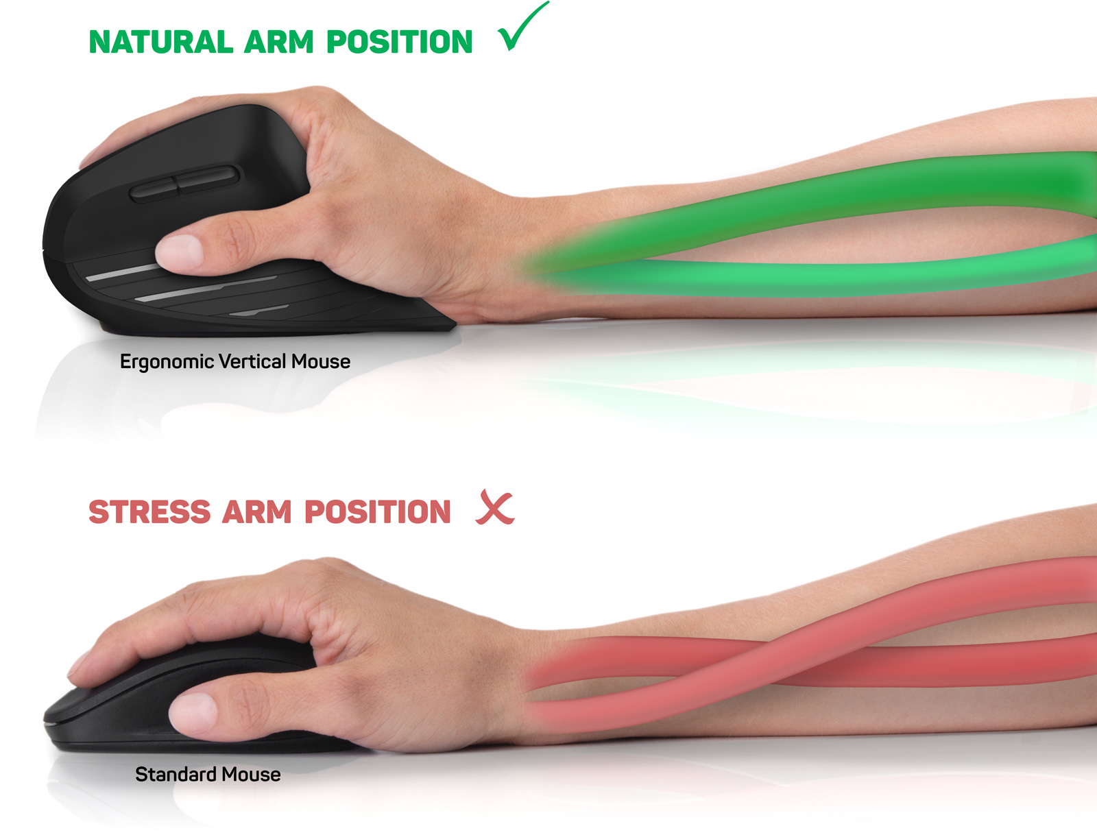 Při práci s běžnou počítačovou myší jsou kosti předloktí v nepřirozeně zkřížené poloze a již po krátké době dochází k bolestem a únavě celého předloktí. Při dlouhodobém používání takové myši může dojít k chornickým problémům s nutností vyhledat lékařskou pomoc.