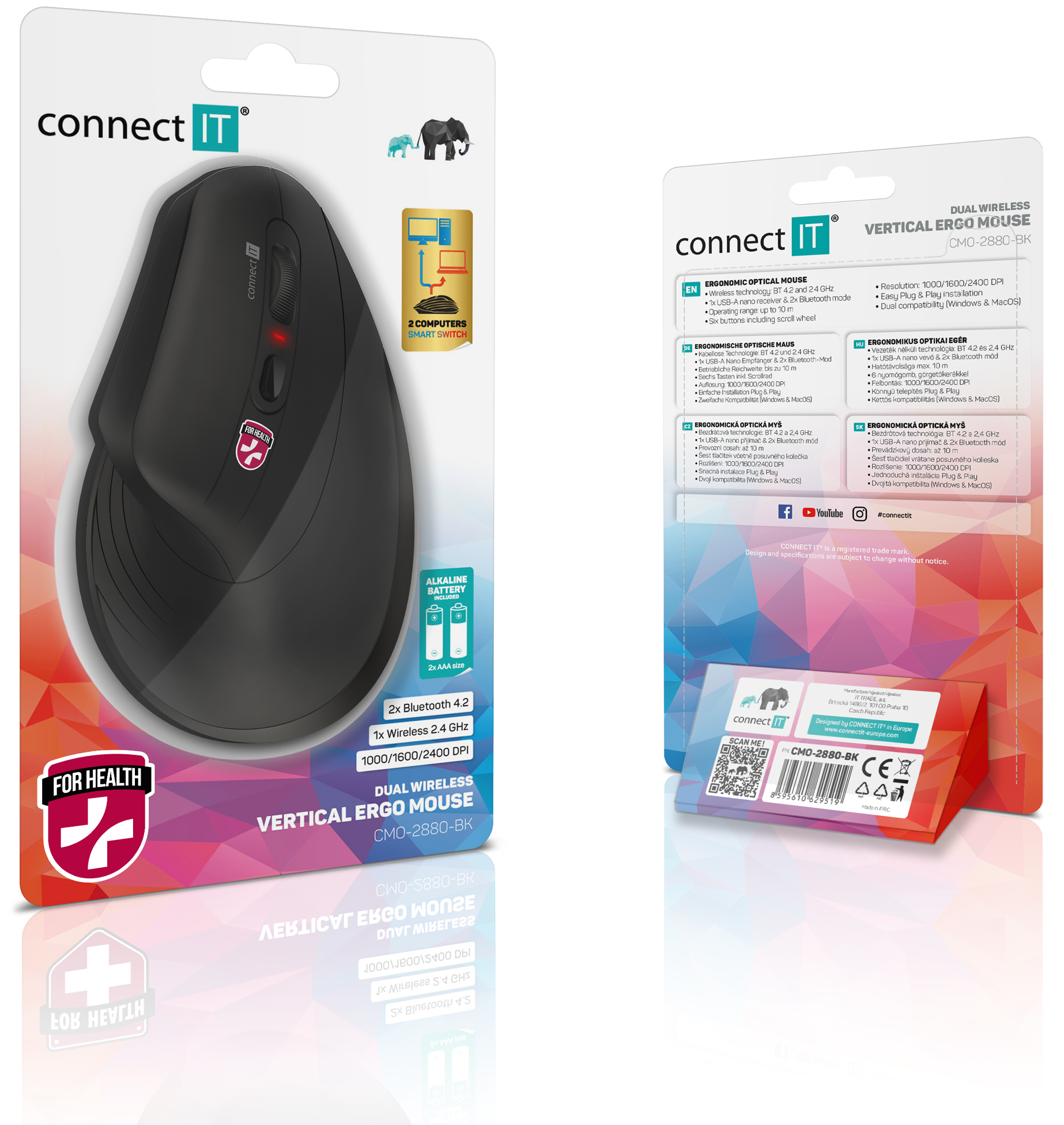 Vertikální ergonomická optická bezdrátová myš FOR HEALTH Verti TriMode BLACK určená speciálně jako prevence proti syndromu karpálního tunelu. Nabízí možnost připojení na tři počítače díky technologii TriMode (2x Bluetooth 4.2 + 2.4 GHz wireless). DPI rozlišení 2400 DPI. 6 tlačítek včetně precizního otočného kolečka. Dvě mikrotužkové baterie součástí balení.