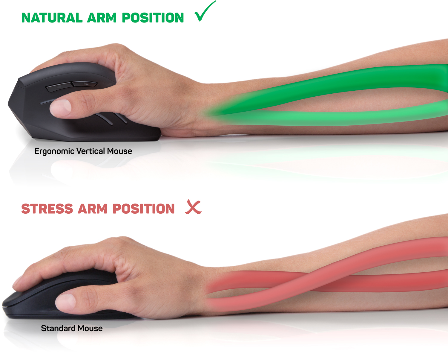 Při práci s běžnou počítačovou myší jsou kosti předloktí v nepřirozeně zkřížené poloze a již po krátké době dochází k bolestem a únavě celého předloktí. Při dlouhodobém používání takové myši může dojít k chornickým problémům s nutností vyhledat lékařskou pomoc.