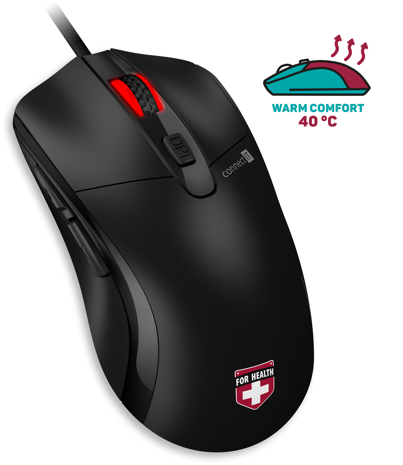 Vyhřívaná drátová myš řady FOR HEALTH se šesti tlačítky, rozlišením 1600 DPI, prémiovým opletem kabelu s pozlaceným USB konektorem.