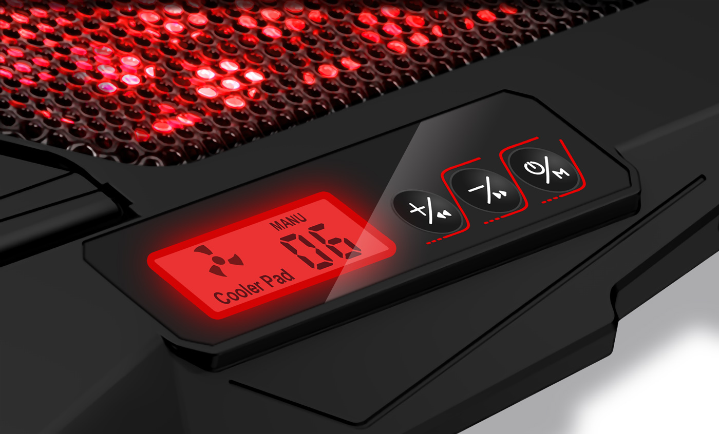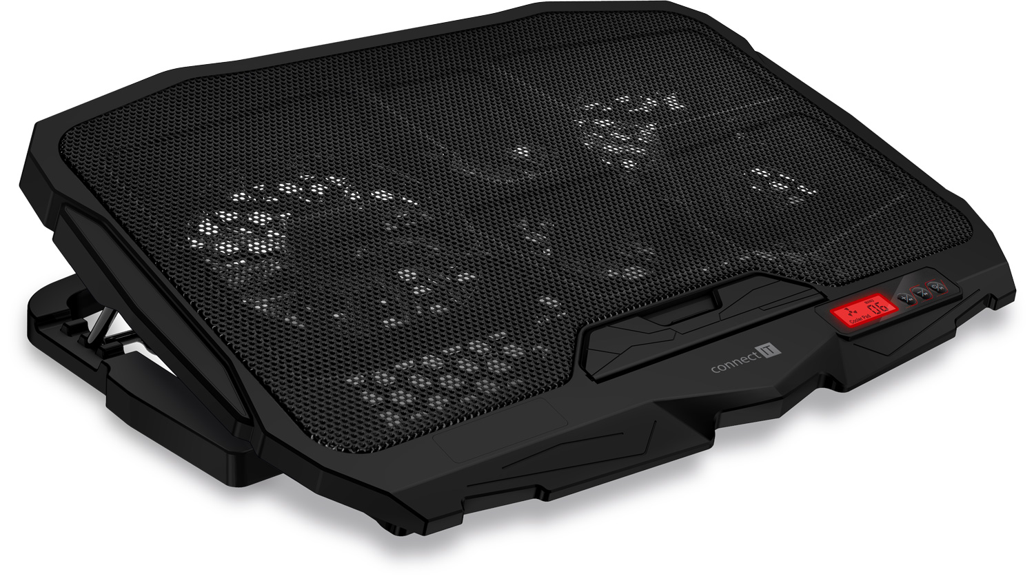 Chladicí podložka pod notebook se čtyřmi šestirychlostními ventilátory, digitálním displejem, výškovým polohováním ve 4 úrovních a dvěma USB porty.