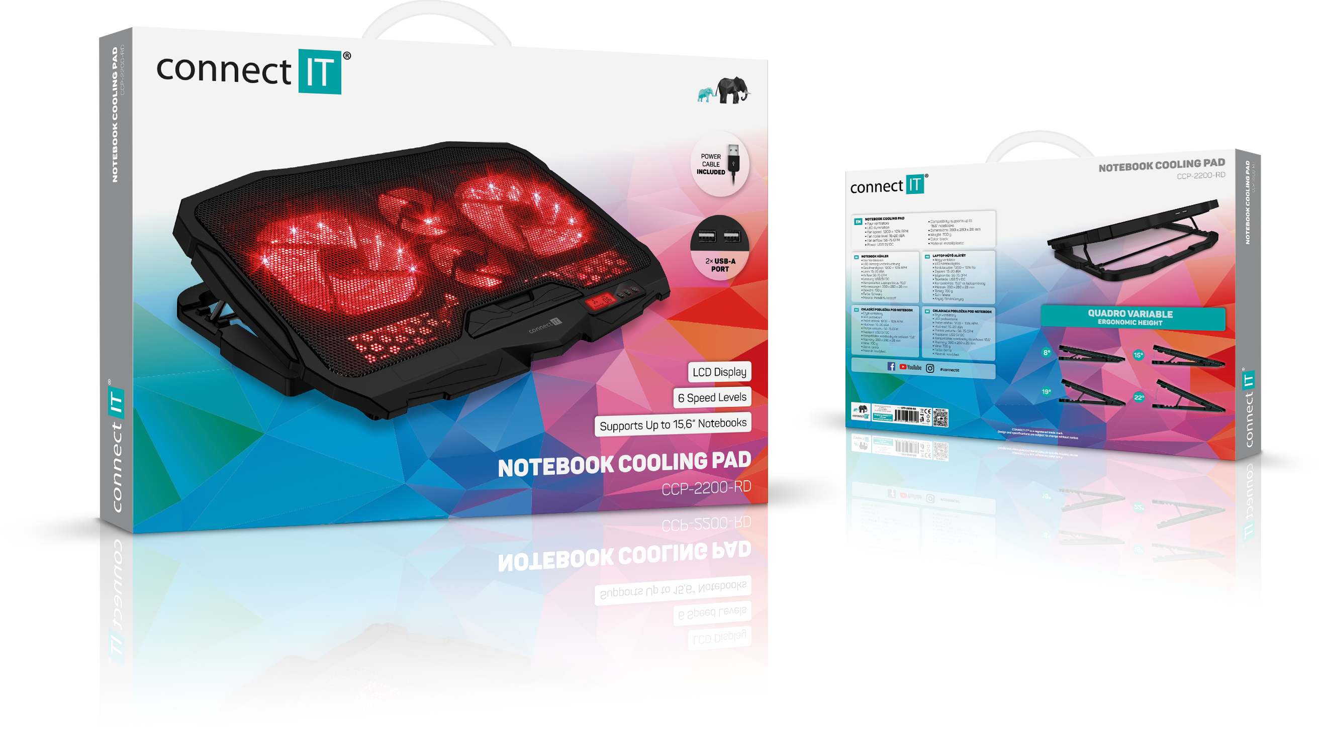 Podložka zajišťuje jak odvod tepla z notebooku a jeho ventilačních otvorů, tak i přímé ochlazování pláště notebooku díky cirkulaci chladného vzduchu a celkově tak zvyšuje výkon notebooku. Je plně kompatibilní s notebooky až do velikosti 15,6" a díky kompaktním rozměrům je předurčena jak pro práci doma a v kanceláři, tak i pro cestování a časté přenášení. Ultratichý chod 4 ventilátorů vás nebude rušit ani při nejnáročnější práci vyžadující maximální soustředění. Výšková polohovatelnost ve 4 různých stupních vám zajišťuje maximální pohodlí i při delších pracovních či herních sezeních.