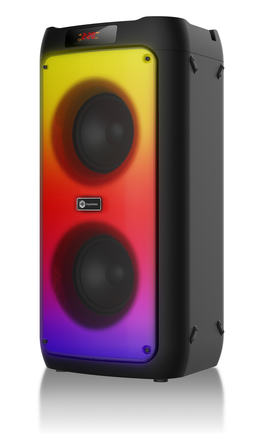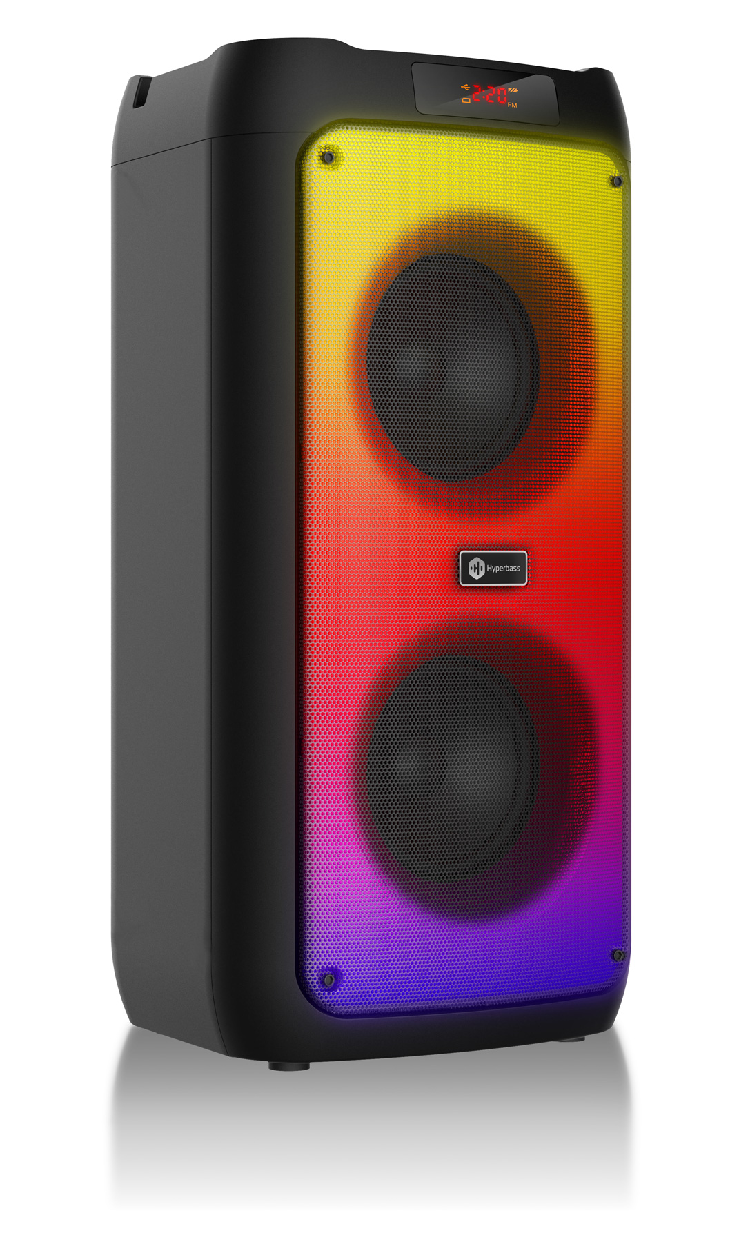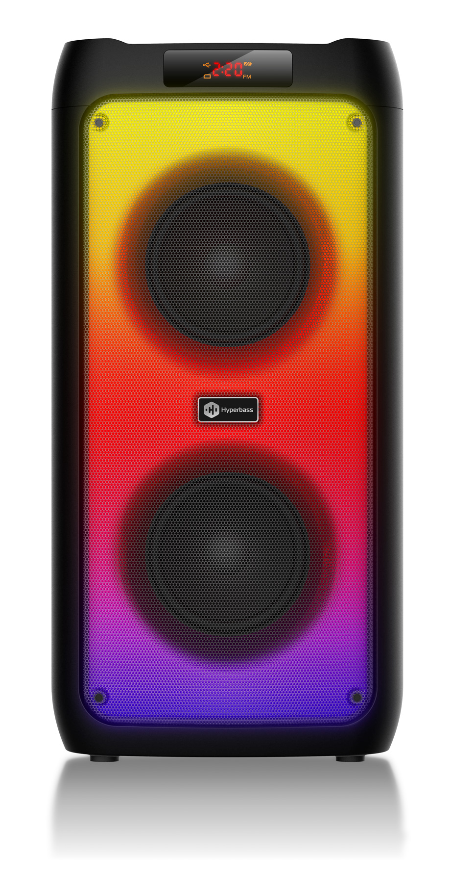 Bezdrátový reproduktor Hyperbass BEAT+ vás překvapí nejen svým zvukem, ale i kvalitním zpracováním. Celý přední panel disponuje barevným LED podsvícením s možností přepínání několika světelných módů. Obsahuje také informační LED displej, možnost ovládání na dálkové ovládání a připojení externího mikrofonu (dálkové ovládání a mikron jsou součástí dodávky).