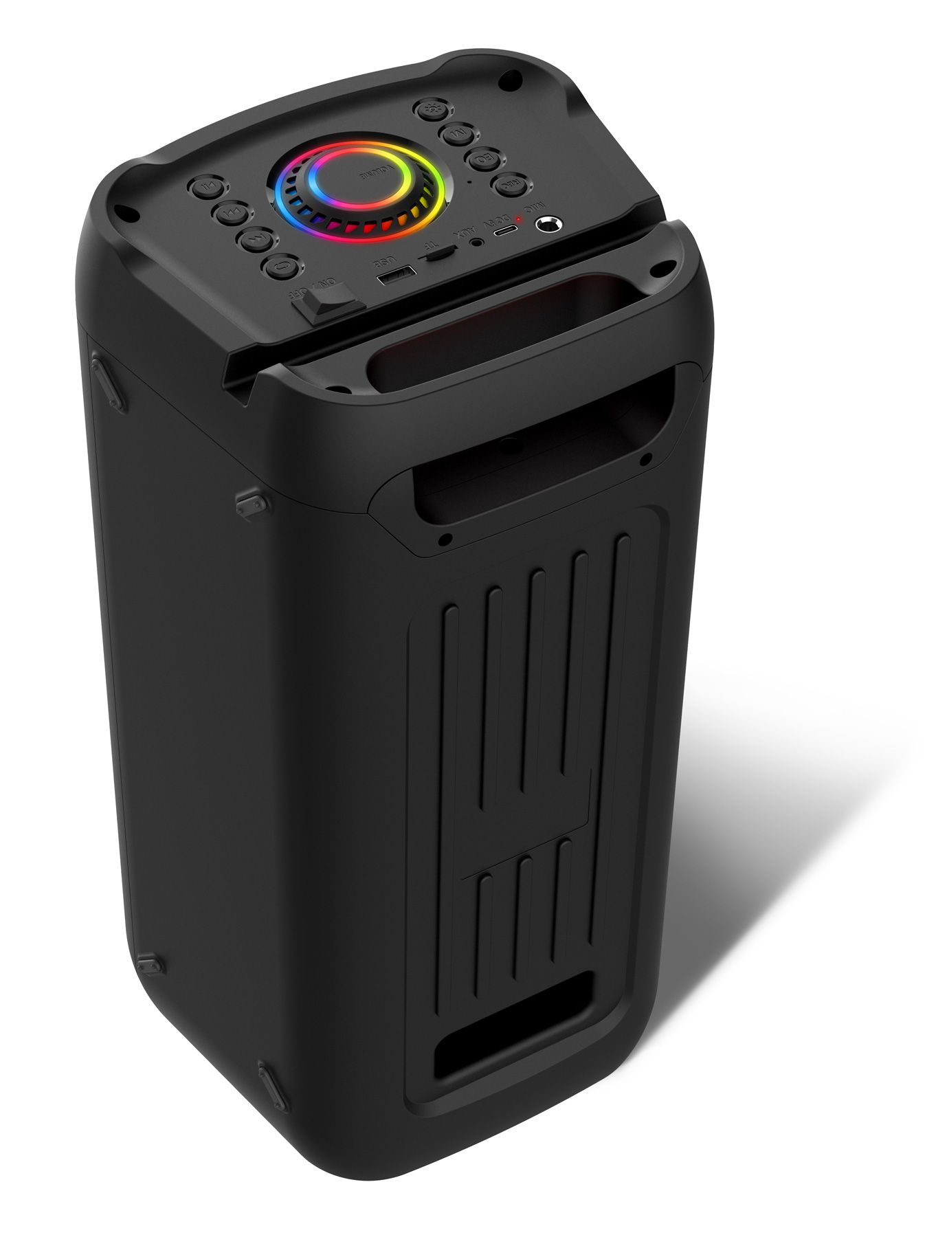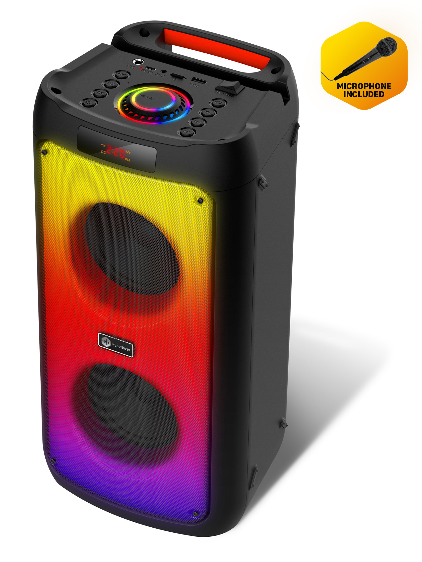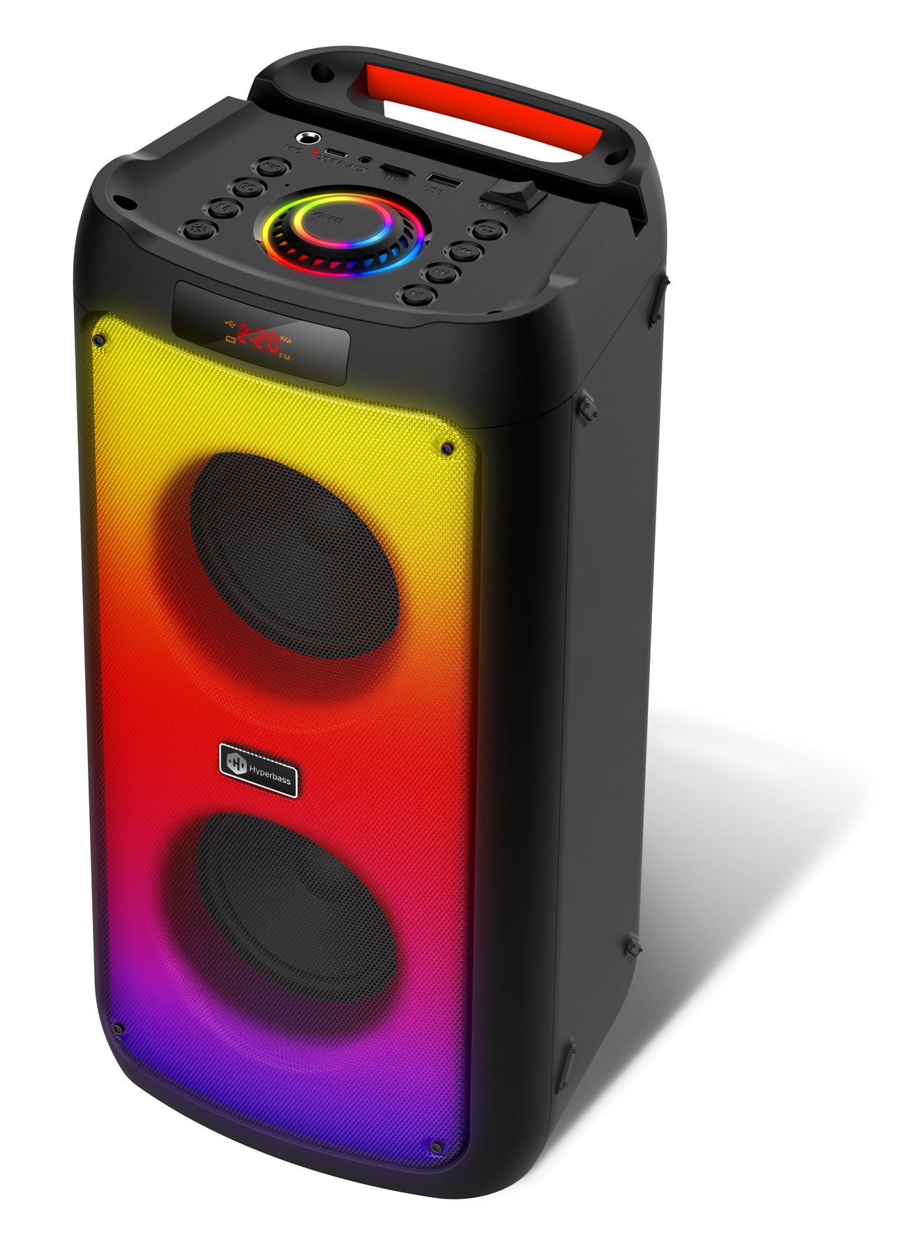 Bezdrátový reproduktor Hyperbass BEAT+ vás překvapí nejen svým zvukem, ale i kvalitním zpracováním. Celý přední panel disponuje barevným LED podsvícením s možností přepínání několika světelných módů. Obsahuje také informační LED displej, možnost ovládání na dálkové ovládání a připojení externího mikrofonu (dálkové ovládání a mikron jsou součástí dodávky).