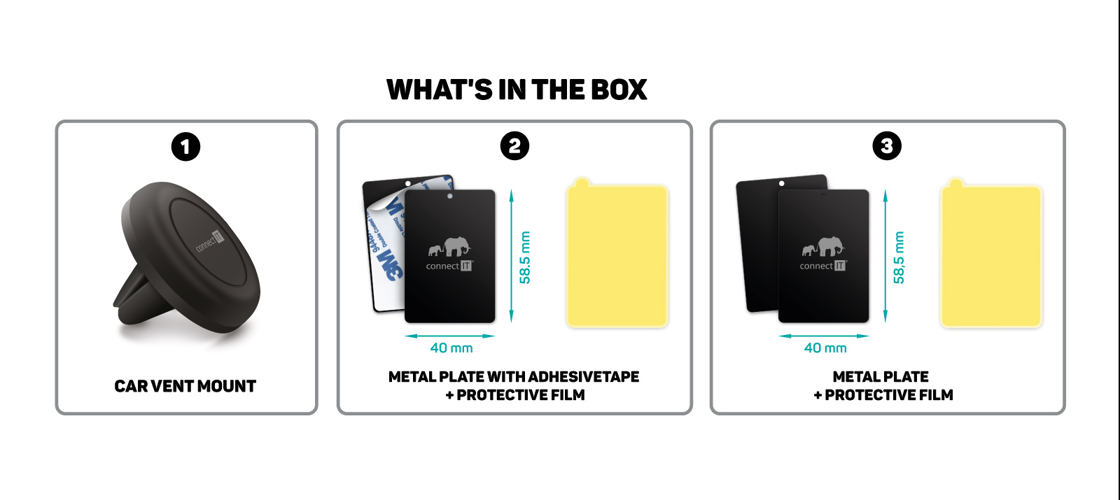 Unifikovaný rozměr kovových destiček 40 × 58,5 mm garantuje komfortní kontakt telefonu s magnetickým držákem a kompatibilitu se všemi telefony