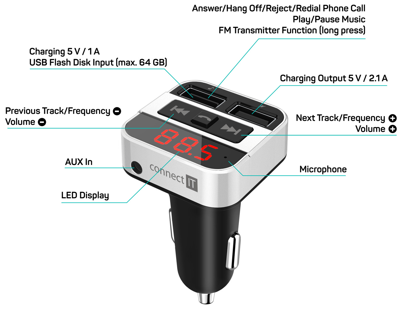 Bluetooth transmitter v kombinaci s dvouportovou nabíječkou je multifunkčí zařízení do vašeho automobilu, díky němuž můžete nejen nabíjet mobilní zařízení, ale také poslouchat hudbu ze svého USB flash disku nebo mobilního telefonu. Transmitter je vybaven digitálním displejem a třemi ovládacími tlačítky pro jednoduché a komfortní ovládání všech funkcí. Navíc je možno připojit i externí zdroj hudby přes 3,5 mm Jack AUX vstup. Samozřejmostí u tohoto zařízení je i možnost bezdrátového spárování s vašim mobilním telefonem pro uskutečňování telefonních hovorů. Pro tento účel nechybí ani vestavěný mikrofon.