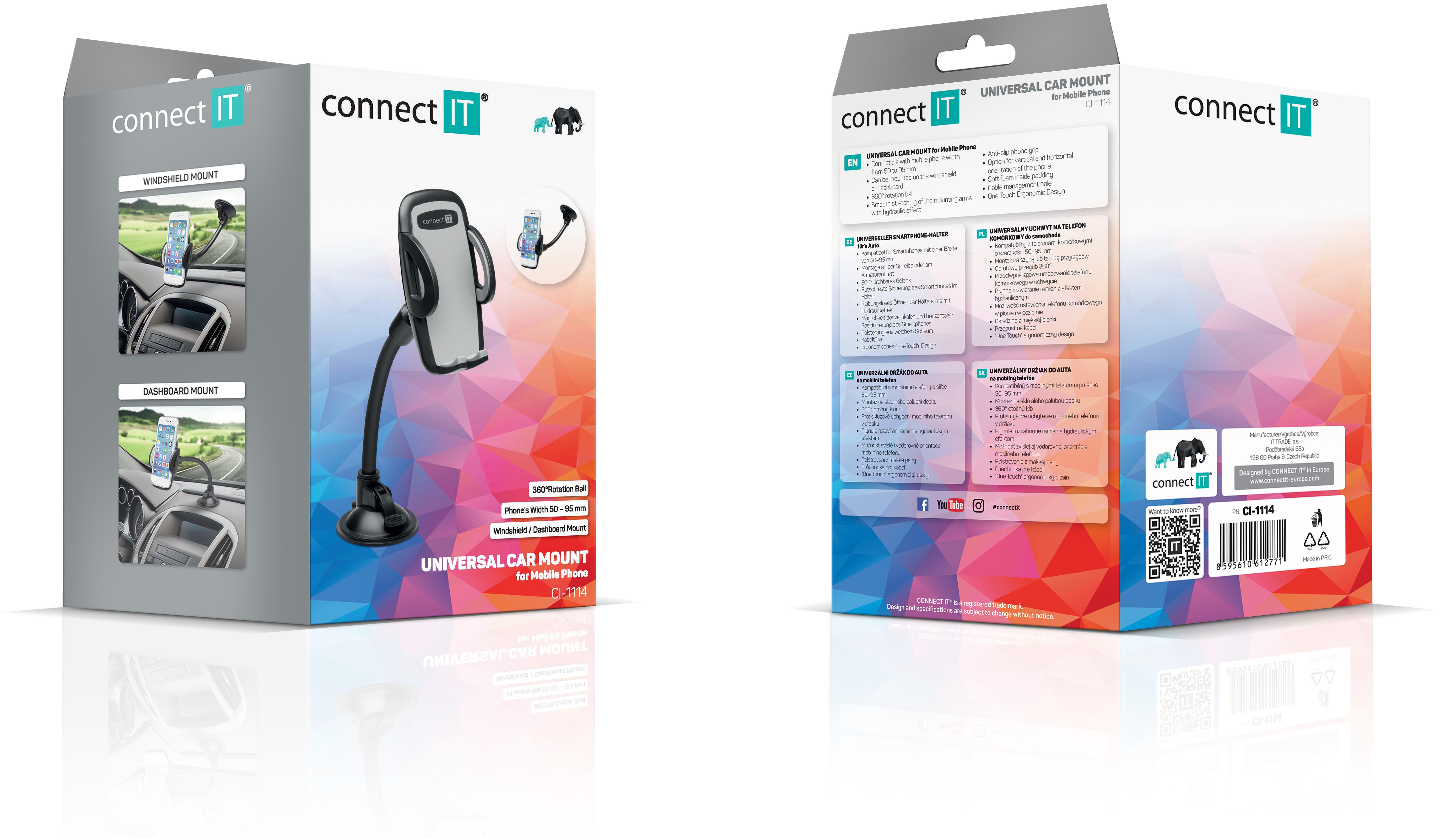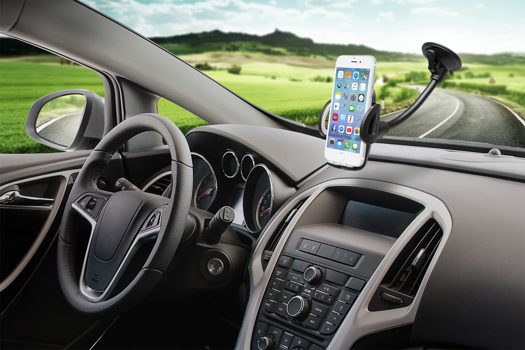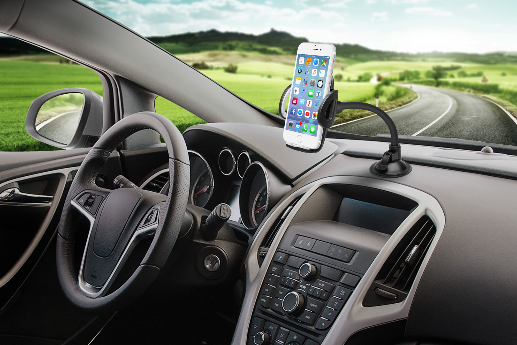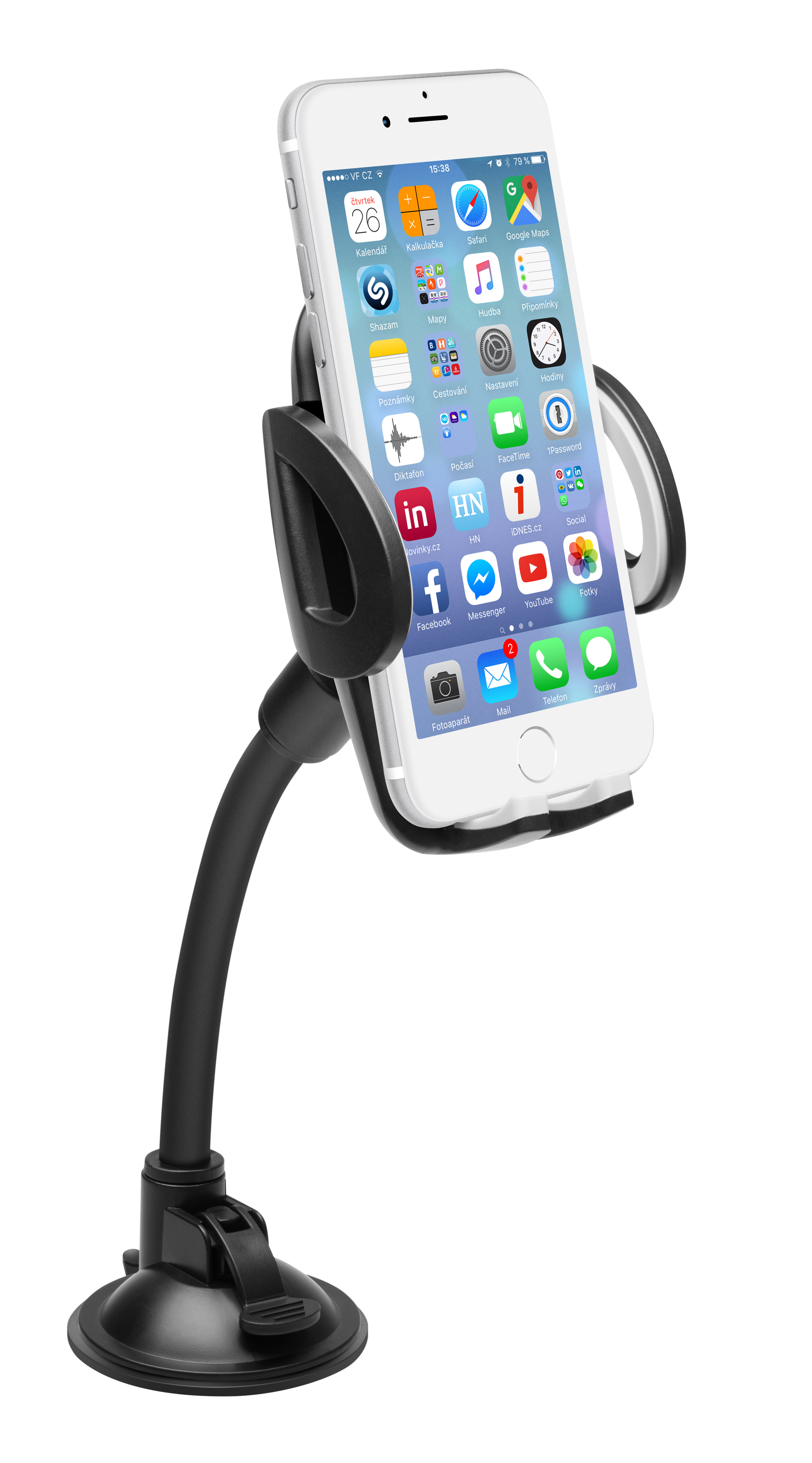 Univerzální držák do auta slouží k uchycení mobilního telefonu na sklo nebo palubní desku vozu. Umožňuje komfortní a bezproblémové používání mobilního telefonu během jízdy. Držák je kompatibilní se všemi telefony o šířce 50 - 95 mm. Díky dlouhému ohebnému krku a otočnému kloubu lze telefon orientovat svisle i vodorovně a nastavit na jakýkoliv sklon a vzdálenost od čelního skla až do 225 mm.