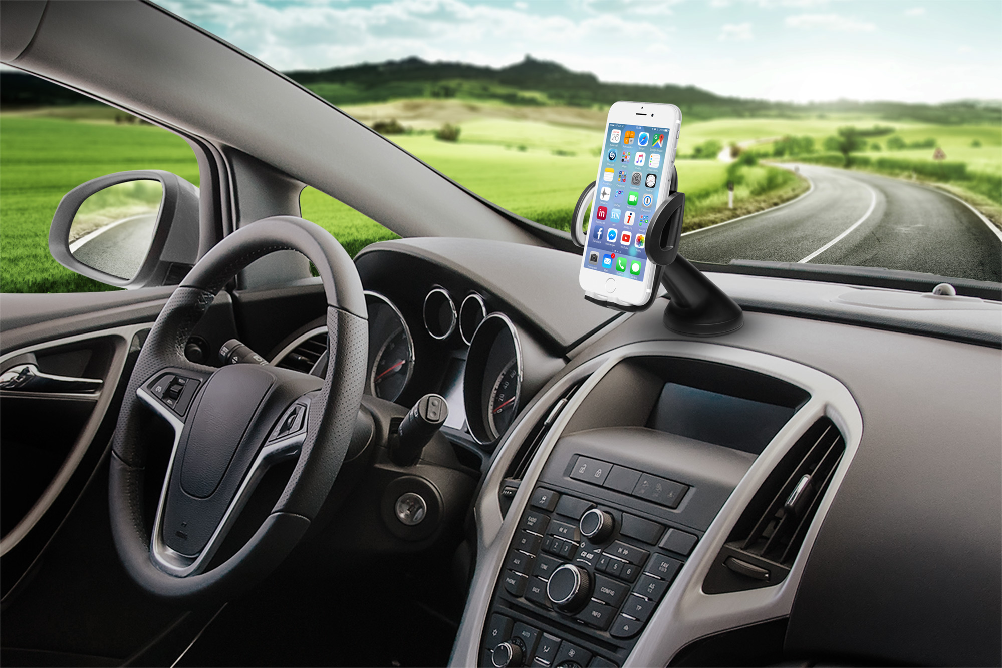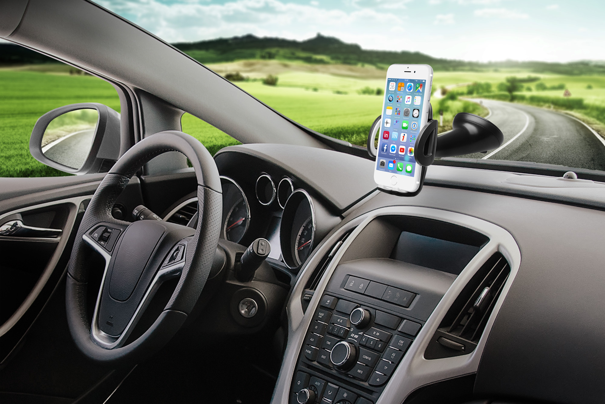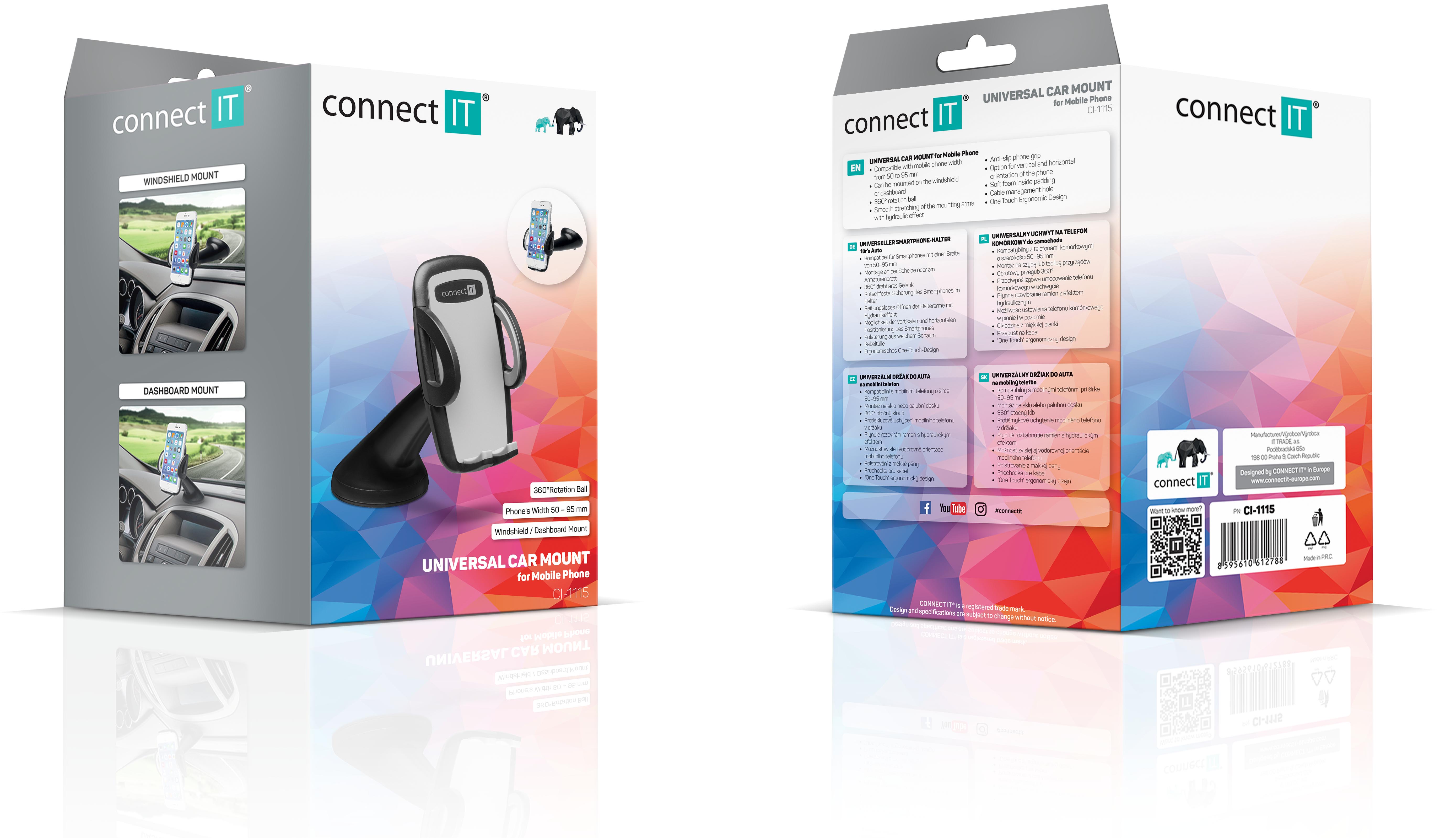 Univerzální držák do auta slouží k uchycení mobilního telefonu na sklo nebo palubní desku vozu. Umožňuje komfortní a bezproblémové používání mobilního telefonu během jízdy. Držák je kompatibilní se všemi telefony o šířce 50 - 95 mm. Pomocí fixního krku lze telefon orientovat svisle i vodorovně a nastavit na jakýkoliv sklon a vzdálenost od čelního skla až do 150mm.