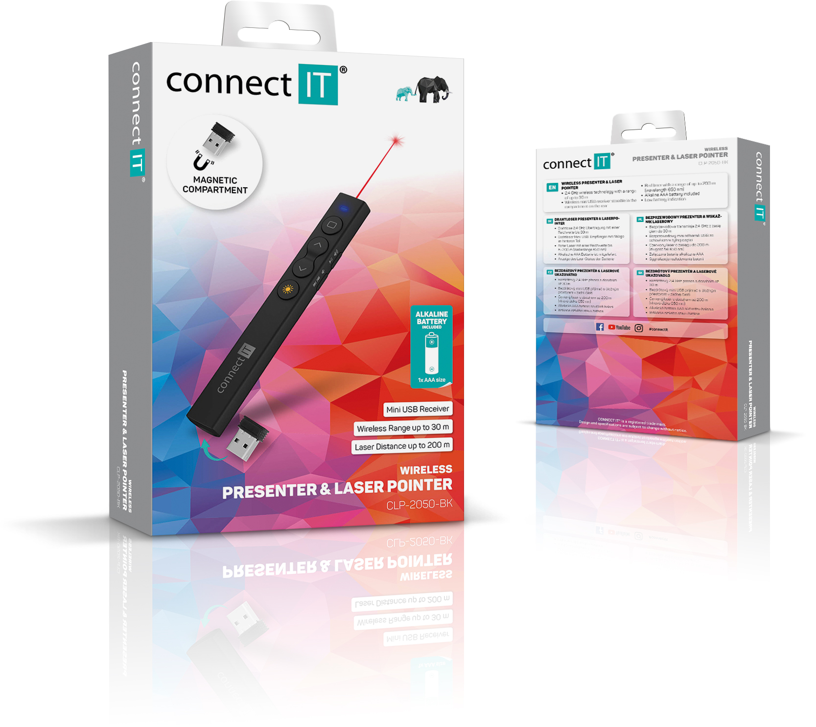 Bezdrátový prezentér s laserovým ukazovátkem CLP-2050-BK vyniká bezdrátovým dosahem až 30 metrů a obdivuhodným dosahem laseru 200 metrů s dvojnásobně lepší viditelností oproti běžným laserům.