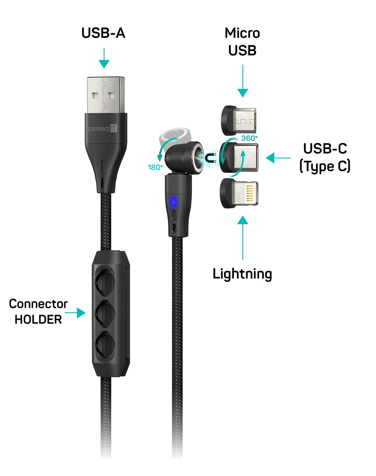 CONNECT IT Magnetic PowerLink 3in1 kabel (USB-C/Lightning/MicroUSB), 2m, ČERNÁ