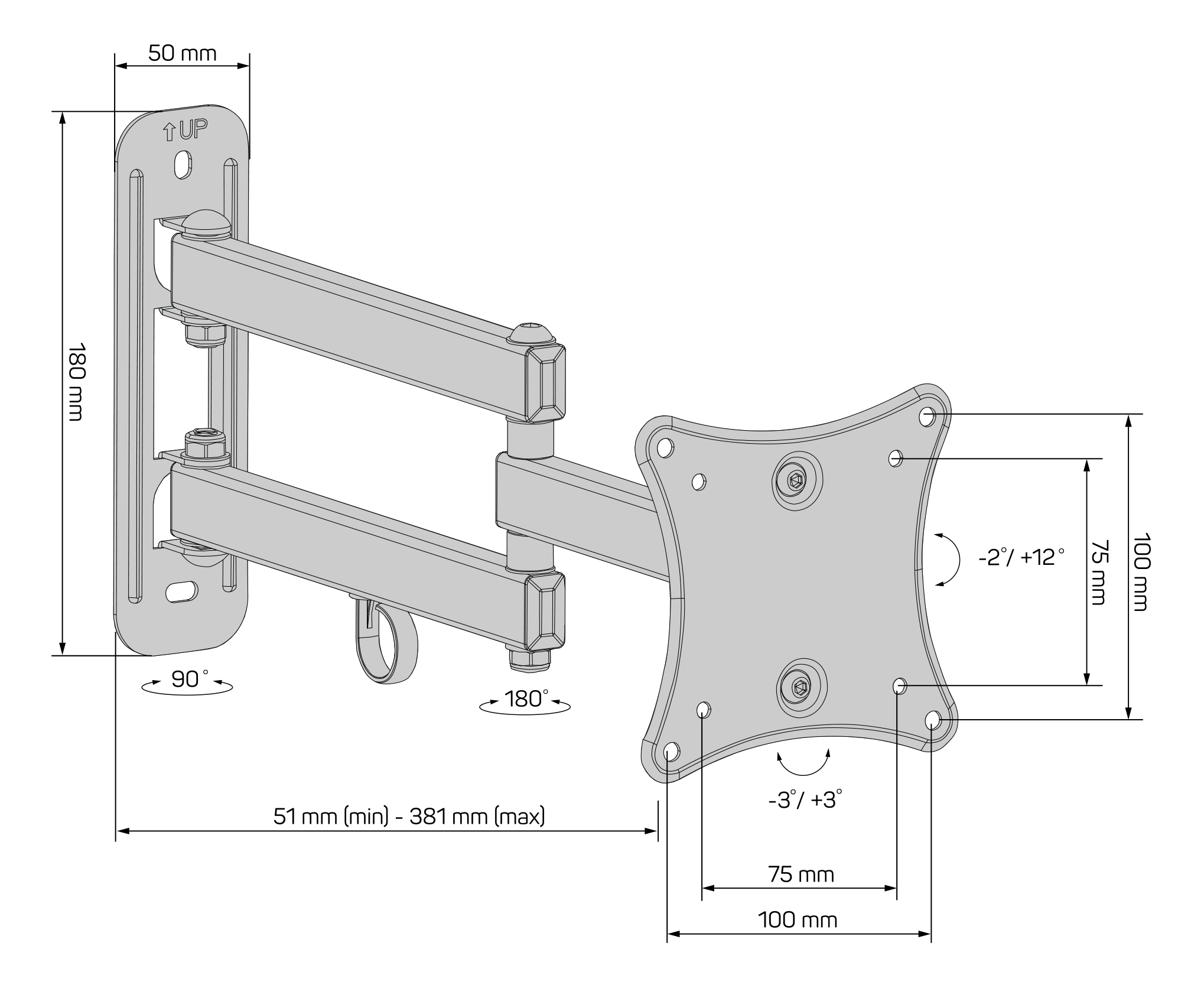 Rozměry držáku při maximální vzdálenosti od stěny (š x v x h): 120 x 180 x 380 mm