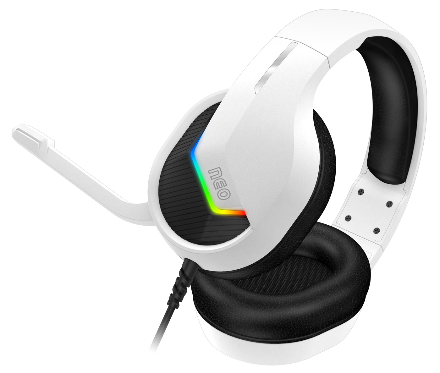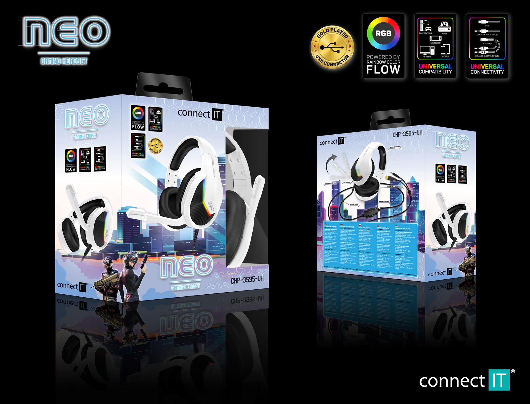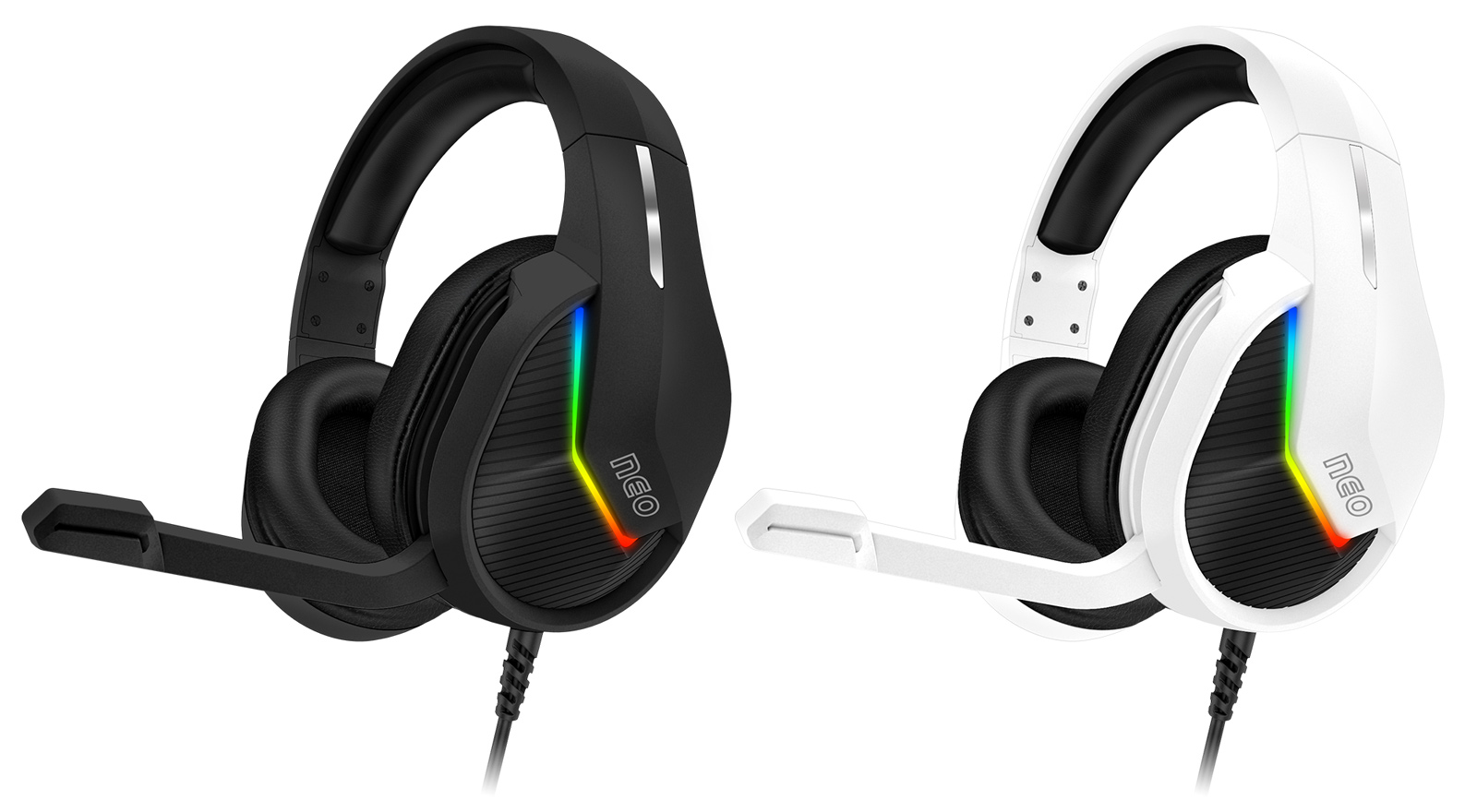 Sluchátka jsou vybavena RGB Rainbow podsvícením, ovládáním hlasitosti, sklápěcím mikrofonem a oblíbenými pozlacenými konektory. V balení najdete i 3.5 mm jack adaptér pro maximální kompatibilitu a arch promo samolepek herní řady NEO.