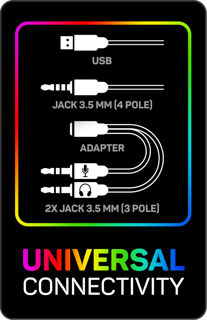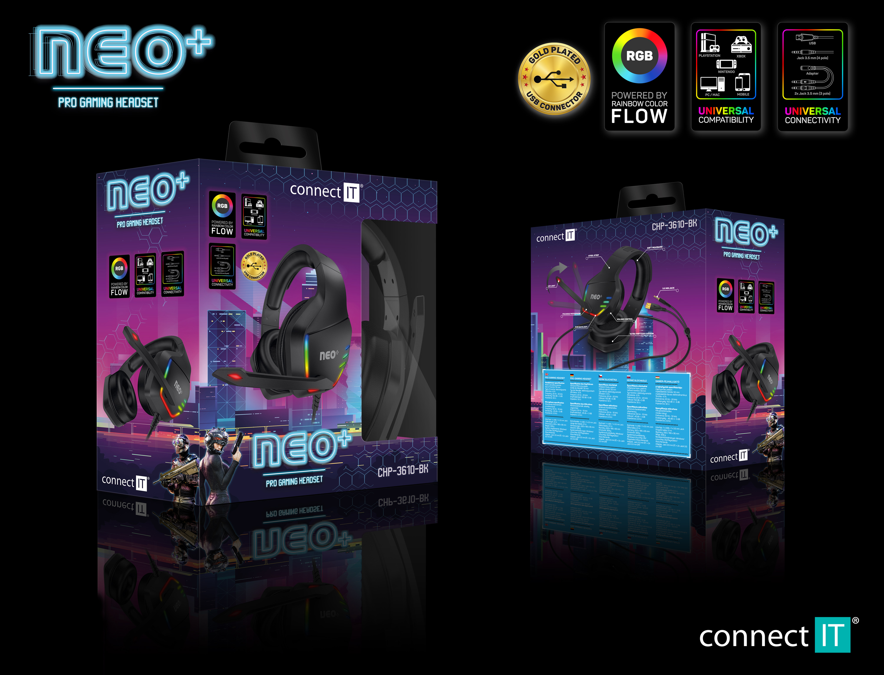 Sluchátka jsou vybavena RGB Rainbow podsvícením, ovládáním hlasitosti, sklápěcím mikrofonem a oblíbenými pozlacenými konektory. V balení najdete i 3.5 mm jack adaptér pro maximální kompatibilitu a arch promo samolepek herní řady NEO.