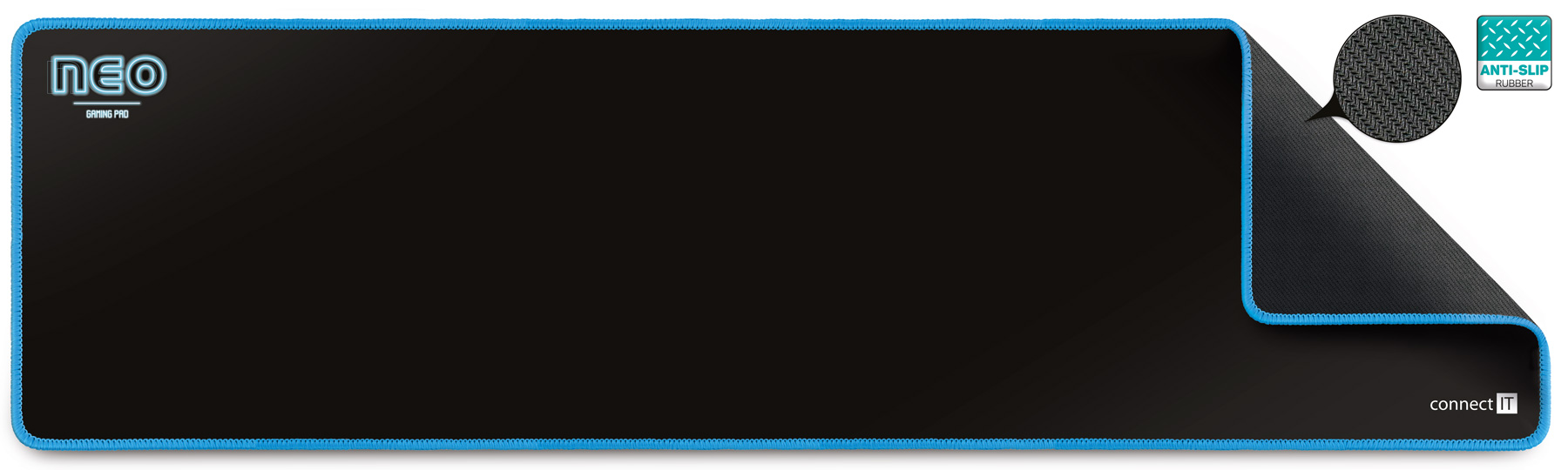 Profesionální podložka herní řady NEO určená i pro amatérské využití. Podložka má měkký, příjemný povrch. Při velikosti herní plochy 886 × 245 mm vám nikdy nedojde prostor k pohybu. Velkou výhodou je pogumovaná protiskluzová spodní strana a antistatický povrch, po kterém bez problému bude jezdit každá myš. Materiál byl navržen tak, aby odpuzoval vodu a nečistoty. Podložka má obšité okraje speciální kvalitní svítící nití, která ve tmě jemně svítí.