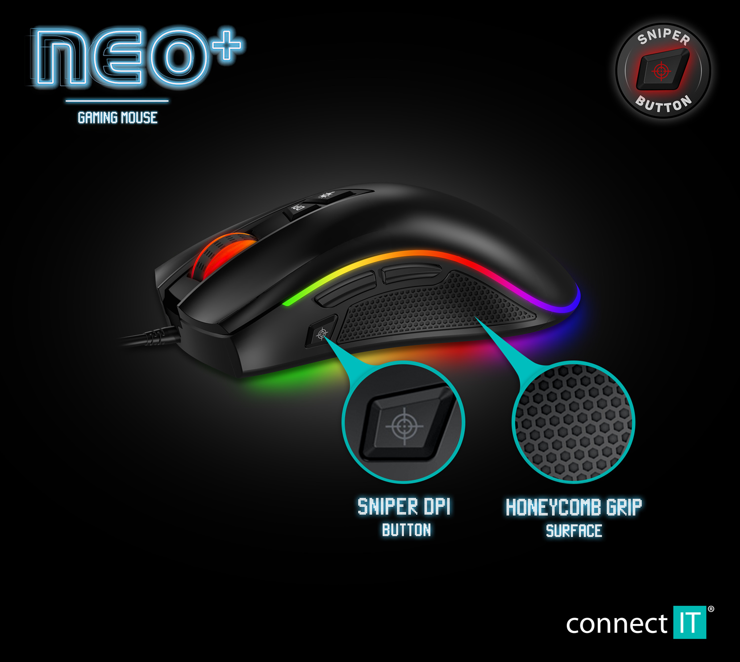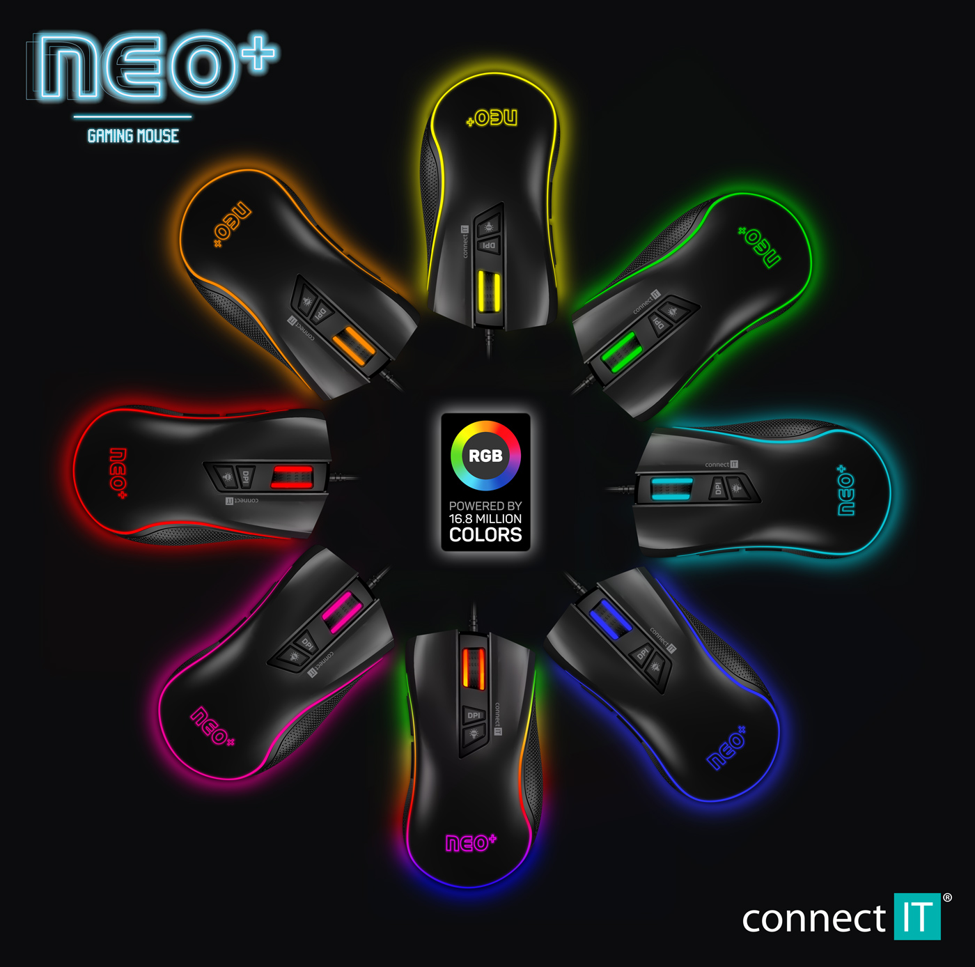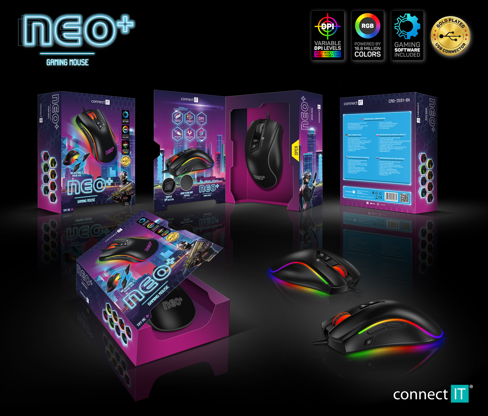 Kromě běžných funkcí je tato myš unikátní nastavitelnou velikostí a to pomocí odnímatelné pravé bočnice. Takto si myš přizpůsobíte svým potřebám. Část myši je pokryta povrchem "honeycomb grip" pro stabilnější a pevnější úchop i při dlouhodobém hraní. K této myši je dodáván arch promo samolepek "CONNECT IT NEO" a software ke stažení zcela zdarma na stránkách www.connectit-europe.com. Samozřejmostí je u této série prémiový oplet přívodního kabelu a pozlacený USB konektor.