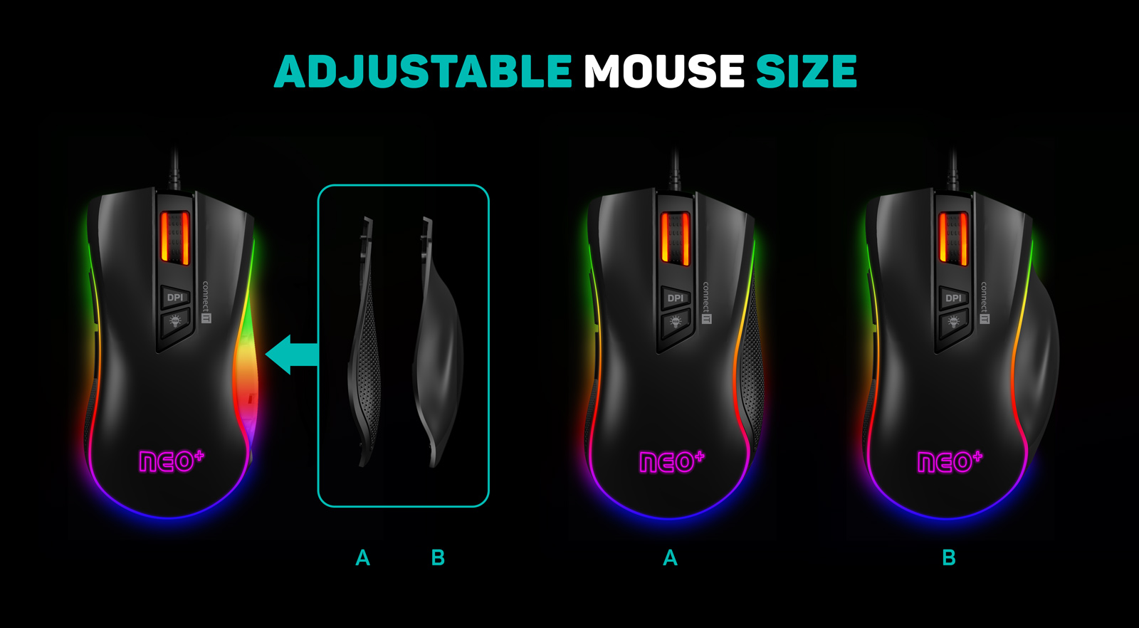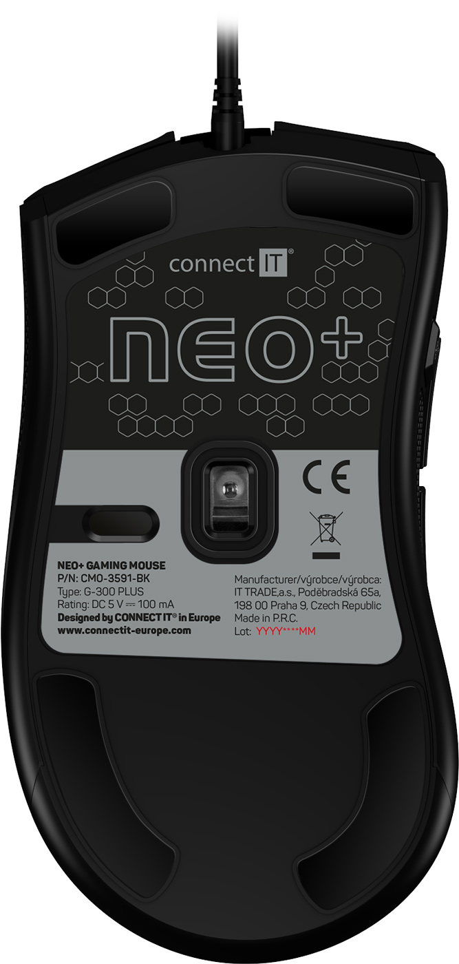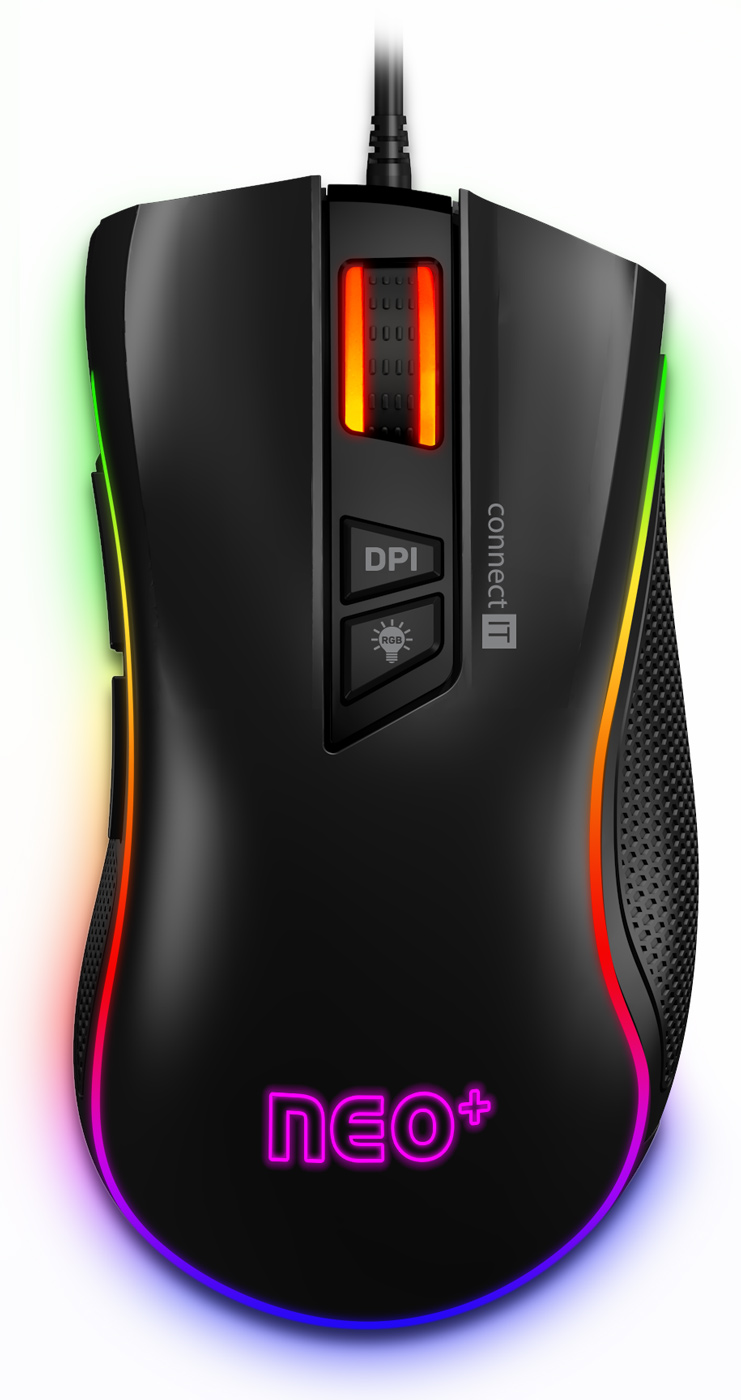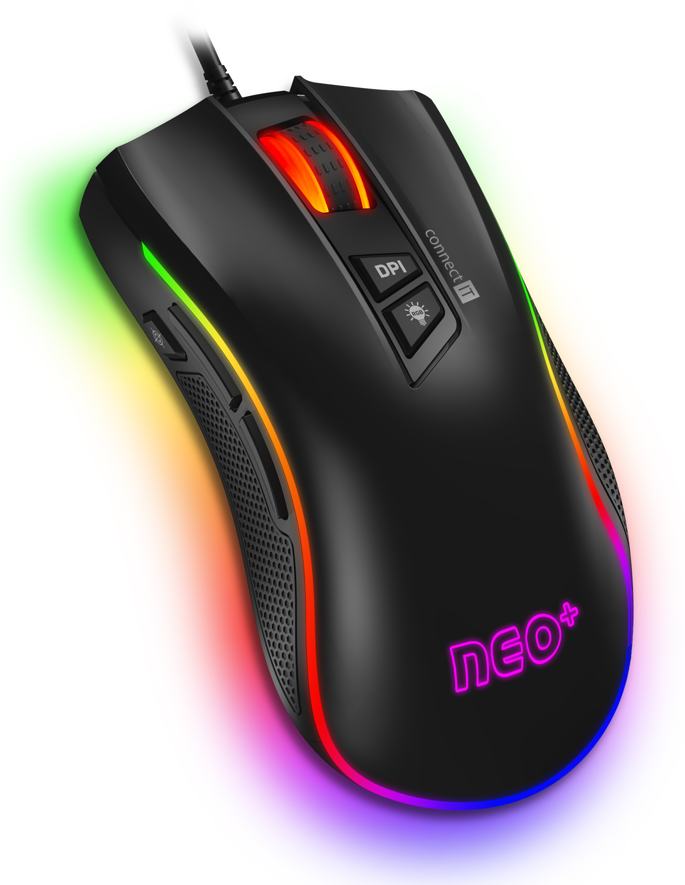 Kromě běžných funkcí je tato myš unikátní nastavitelnou velikostí a to pomocí odnímatelné pravé bočnice. Takto si myš přizpůsobíte svým potřebám. Část myši je pokryta povrchem "honeycomb grip" pro stabilnější a pevnější úchop i při dlouhodobém hraní. K této myši je dodáván arch promo samolepek "CONNECT IT NEO" a software ke stažení zcela zdarma na stránkách www.connectit-europe.com. Samozřejmostí je u této série prémiový oplet přívodního kabelu a pozlacený USB konektor.