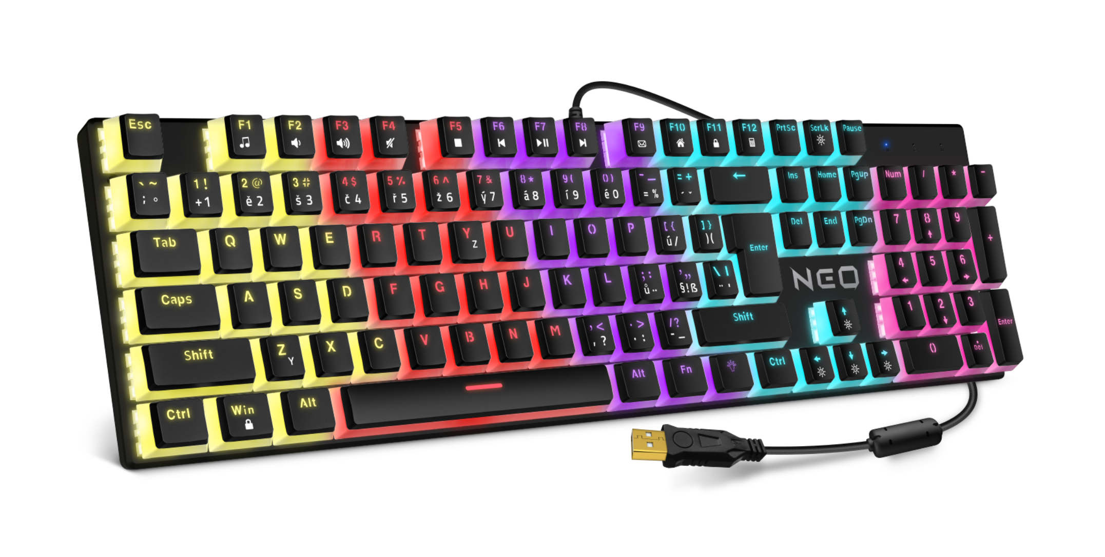 Profesionální mechanická klávesnice z řady NEO series pro hráče počítačových her v českém layoutu s celkem 12 módy barevného rainbow podsvícení a čtyřstupňovou regulací intenzity podsvícení. K dispozici je 12 multimediálních kláves.