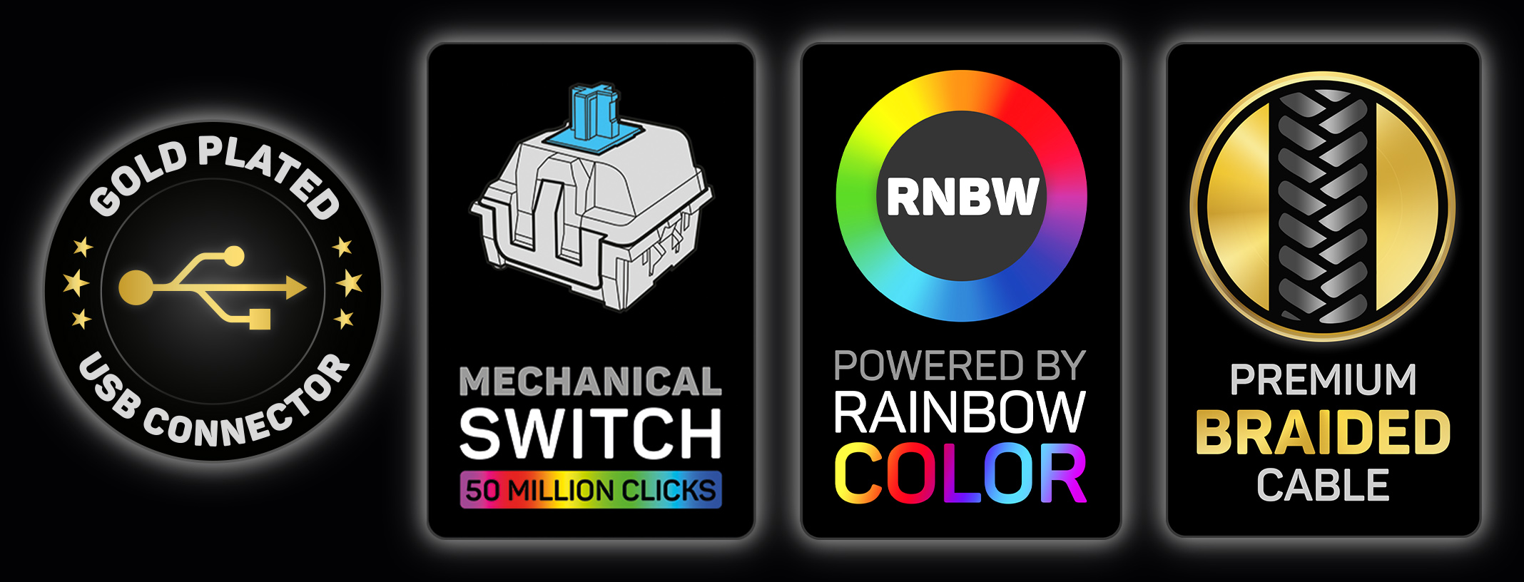 Kromě klasických herních funkcí, tato klávesnice disponuje mechanickými spínači s životností až 50 miliónů kliknutí. Samozřejmostí je u této série prémiový oplet přívodního kabelu a pozlacený USB konektor.