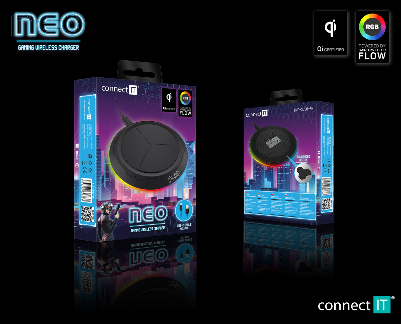 Bezdrátová certifikovaná Qi nabíječka z herní řady NEO series s podporou 10 W rychlonabíjení a RGB podsvícením s 9 volitelnými barevnými módy a USB-C napájecím vstupem (kabel součástí dodávky). Promo arch samolepek herní řady NEO je součástí balení.