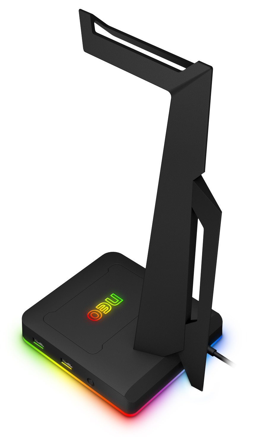 Praktický stolní stojánek na sluchátka pro domácí i profesionální použití s RGB rainbow color flow podsvícením a dvěma USB 2.0 porty.