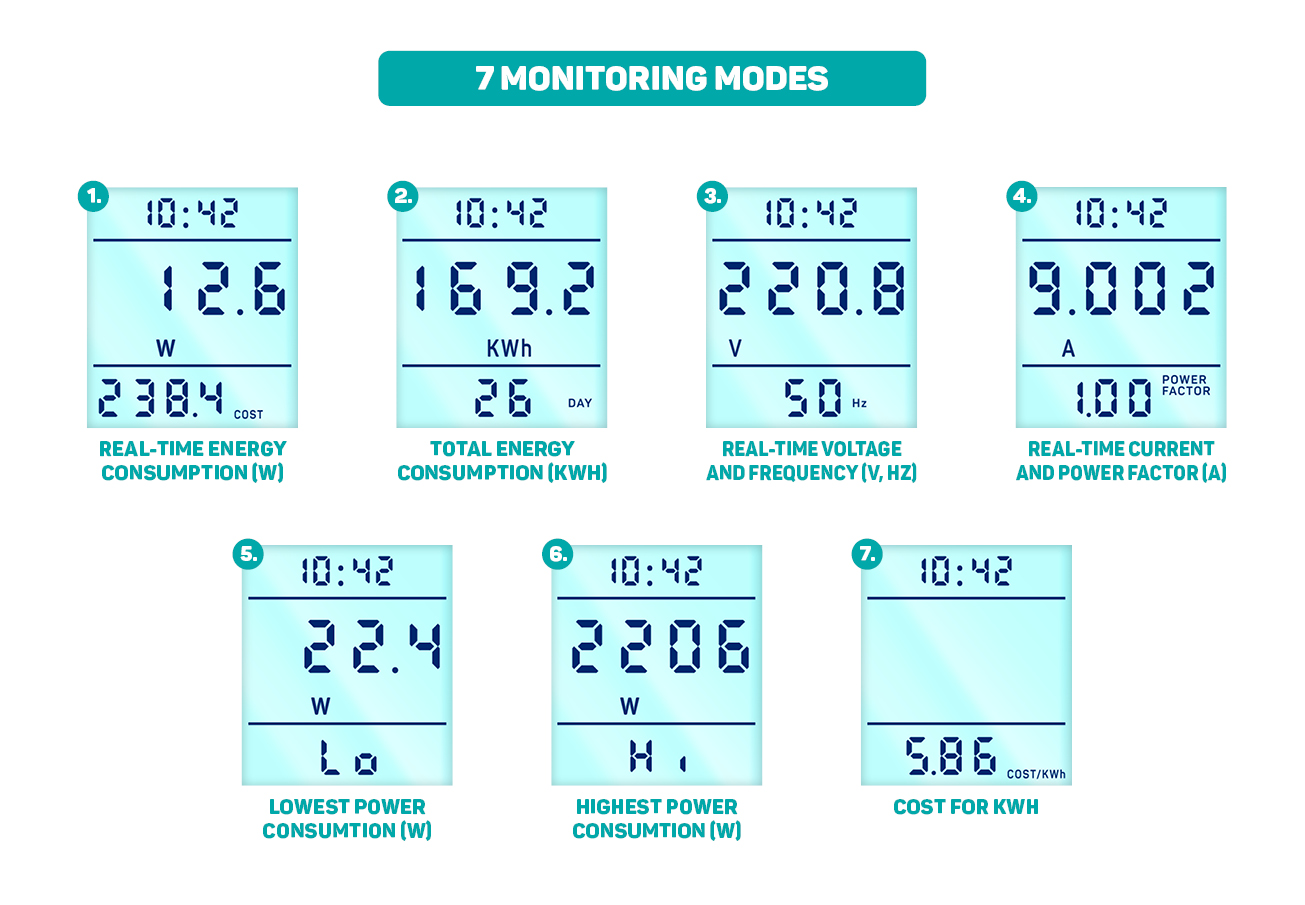 Měřič spotřeby elektrické energie dokáže vypočítat odpovídající finanční náklady a odhalit, který spotřebič odebírá nejvíce elektrické energie a jeho provoz je tedy nejnákladnější. Mezi další funkce měřiče patří měření elektrických veličin - napětí, okamžitý odebíraný výkon, proud, frekvence, nejvyšší a nejnižší spotřeba. Tyto informace Vám mohou přispět ke snížení nákladů za elektrickou energii. Měřič je vybaven interní baterií pro uložení nastavení a údajů v přístoji.
