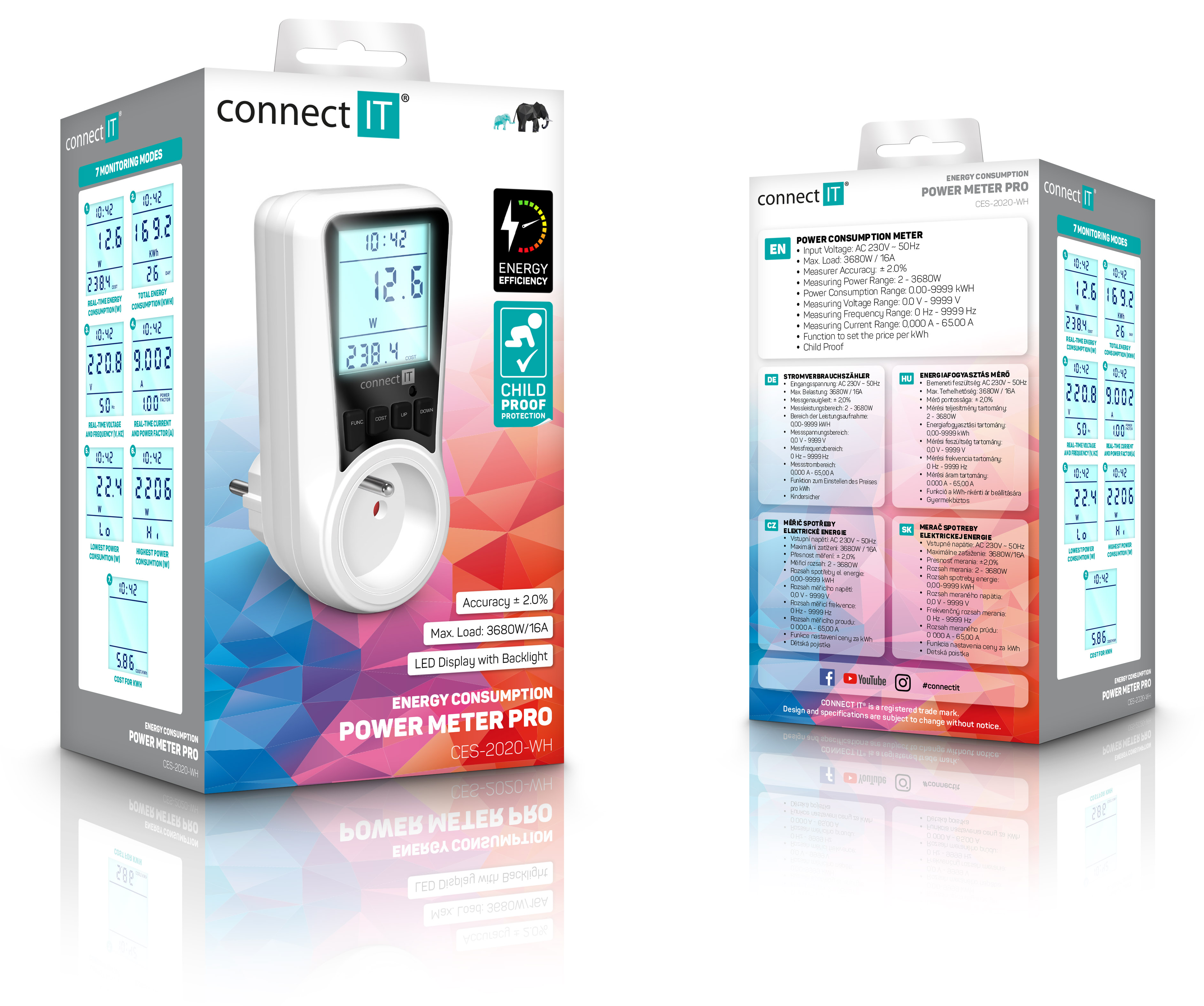 Digitální měřič CONNECT IT "PowerMeter Pro" s jednoduchým designem slouží k měření spotřeby elektrické energie různých domácích spotřebičů. Měřič disponuje velkým podsvíceným LED displejem a jednoduchým ovládáním. Díky tomu je velmi přehledný a spolehlivý.