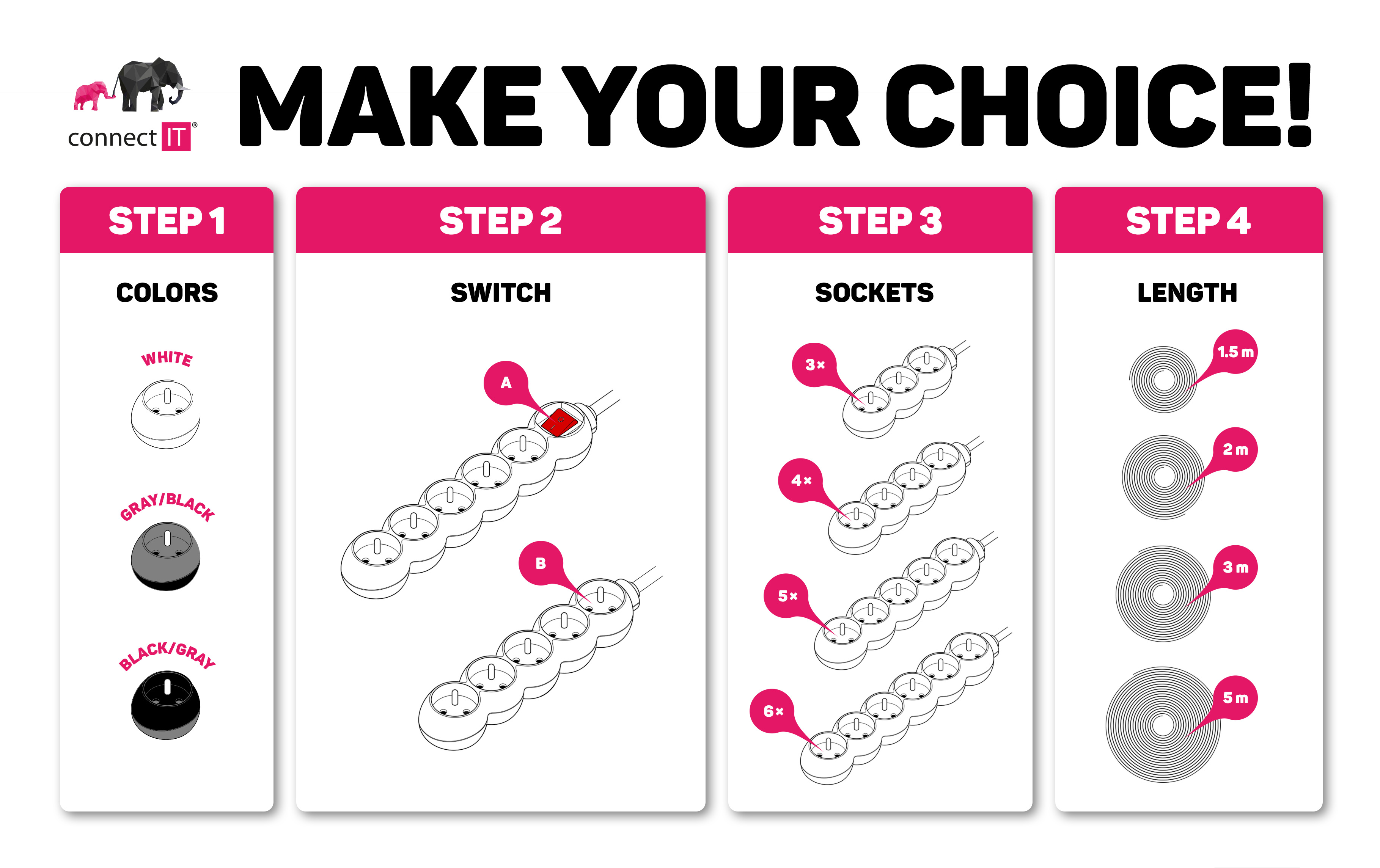 CONNECT IT prodlužovací kabel 230 V, 4 zásuvky, 3 m, s vypínačem (bílý)