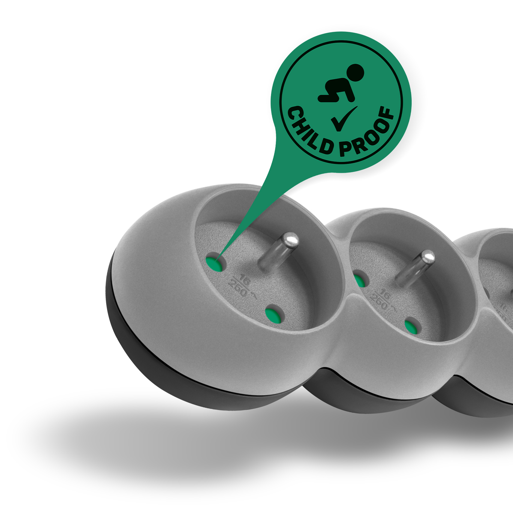 Dětská ochrana všech zásuvek (zásuvky jsou přístupné pouze v případě zasunutí obou vidlic najednou, nelze tedy zasunout jednotlivě např. pouze šroubovák nebo pletací jehlici)