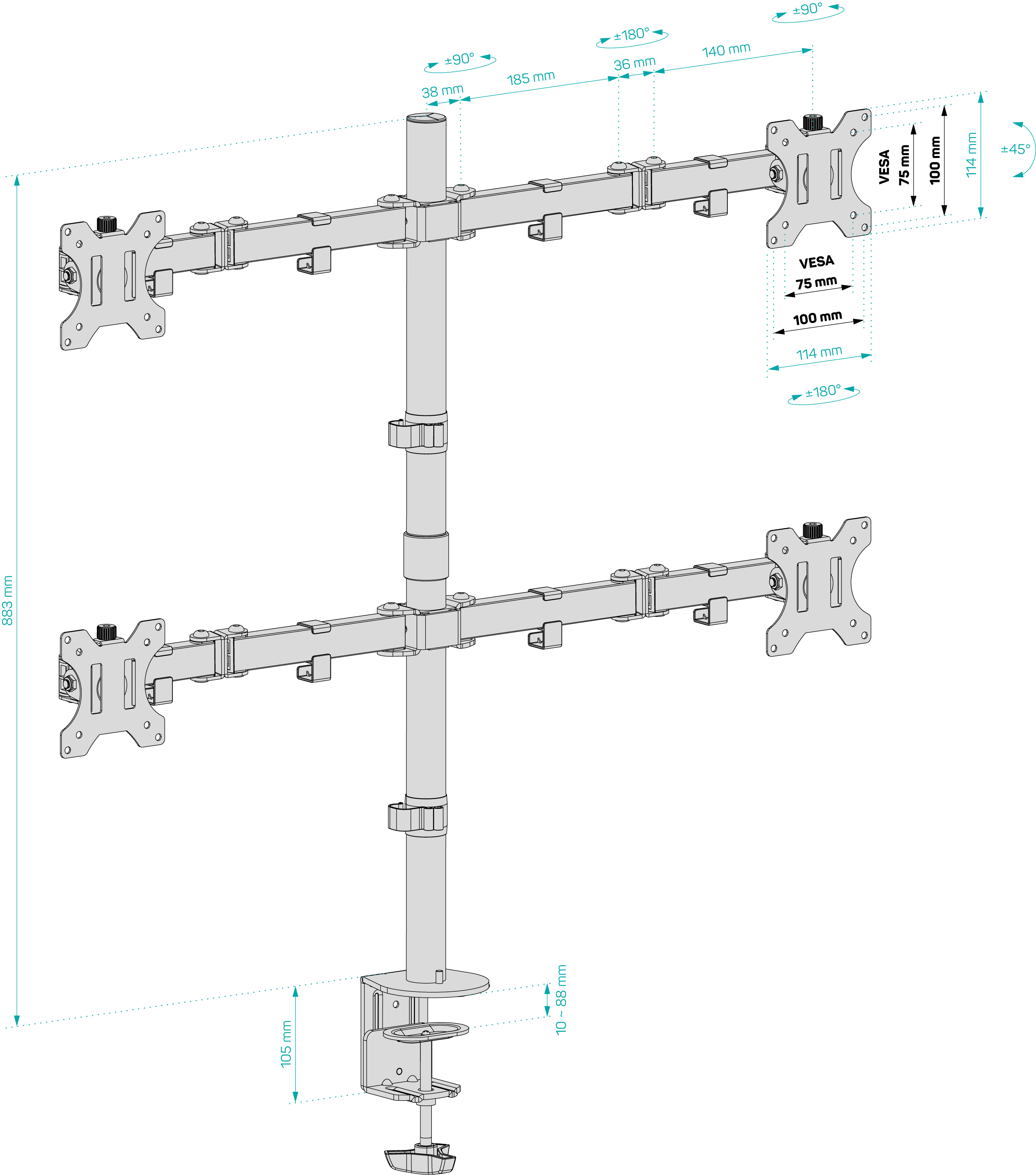 Maximální variabilita díky 5 pohyblivým kloubům pro každý monitor (celkem 20 pohyblivých kloubů)
