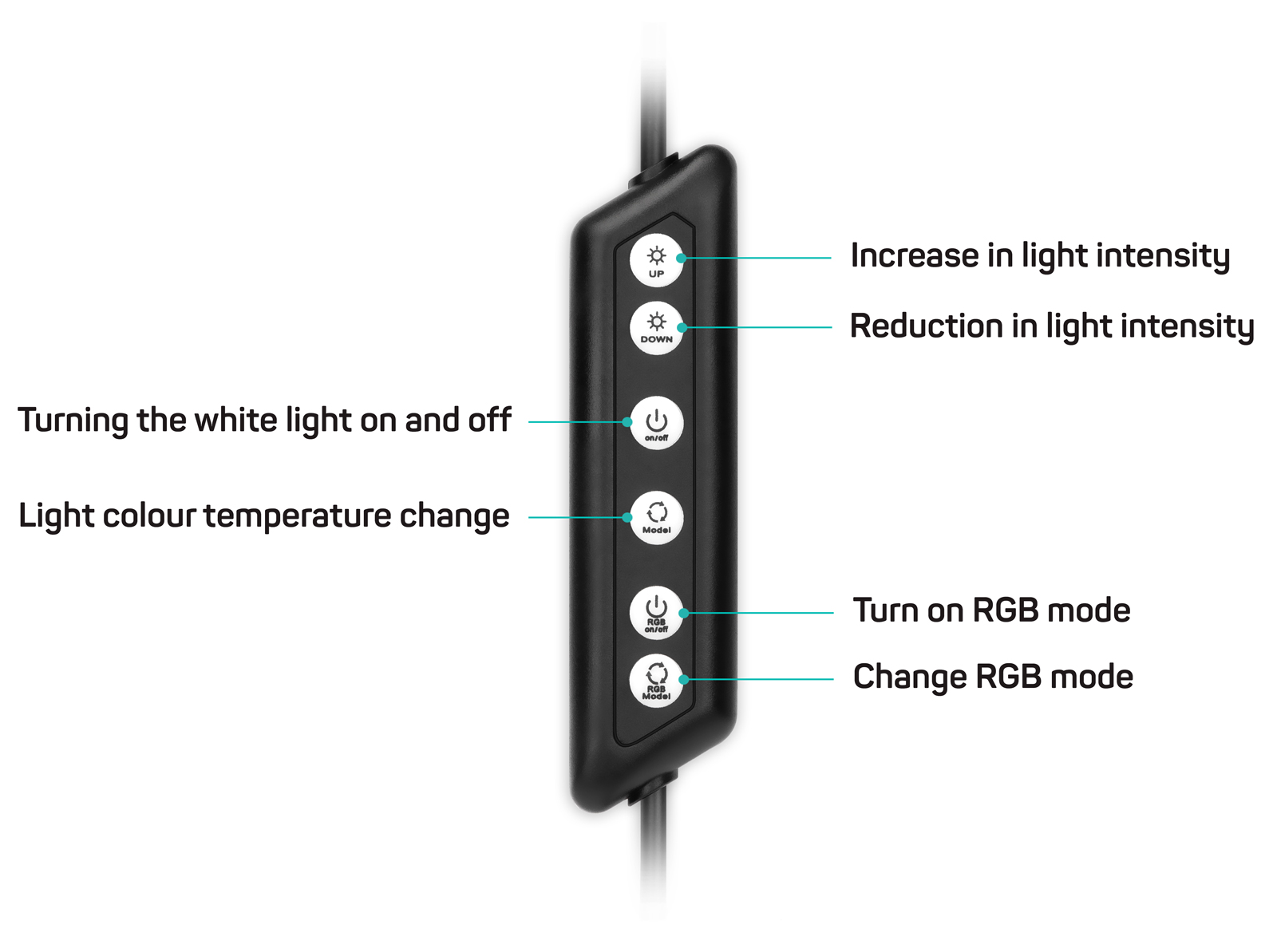 Absolutní svobodu nastavení požadovaného úhlu garantuje kulová hlava. Barevnou teplotu světla je možno nastavit od studené až po teplou ve třech úrovních. Držák mobilního telefonu umístěný na flexibilním husím krku umožňuje pohodlné nastavení do libovolného snímacího úhlu fotografií a videí. Ve výbavě nechybí dálkový ovladač pro vypnutí/zapnutí světla, nastavení jeho intenzity nebo barevné teploty.
