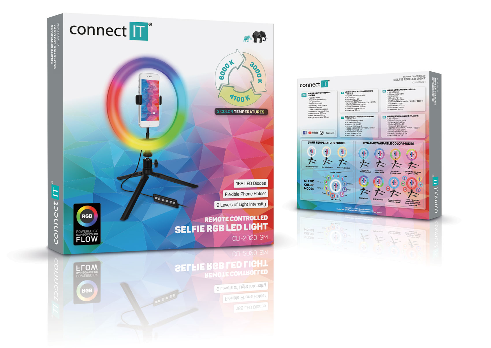 Kruhové selfie LED světlo "Selfie10RGB" s flexibilním držákem na mobilní telefon, stativem s kulovou hlavou a dálkovým ovládáním pro domácí i profesionální použití umožňuje nastavit 12 statických barev, 9 dynamických efektů a barevnou teplotu světla ve 3 různých úrovních (3000/4100/6000 K).